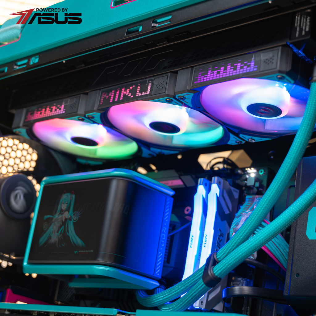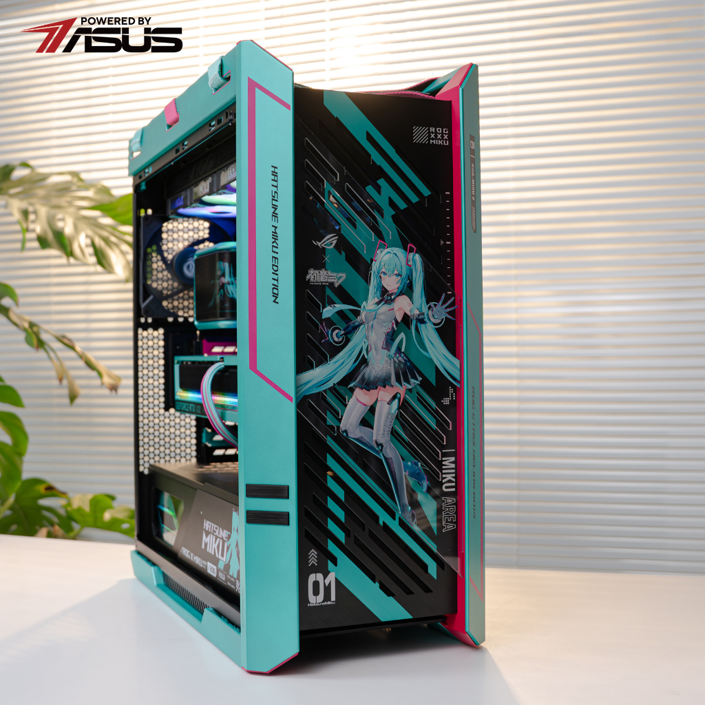 Pc sưu tầm Hatsune Miku sử dụng đồng bộ các linh kiện ASUS ROG Hatsune Miku Edition với tone xanh ngọc đặc trưng, họa tiết Miku độc quyền và hoàn thiện cao cấp. Từ mainboard, VGA, PSU, tản nhiệt cho đến vỏ case, tất cả tạo nên một tổng thể đồng nhất, đúng chất PC gaming flagship dành cho người chơi hệ sưu tầm.