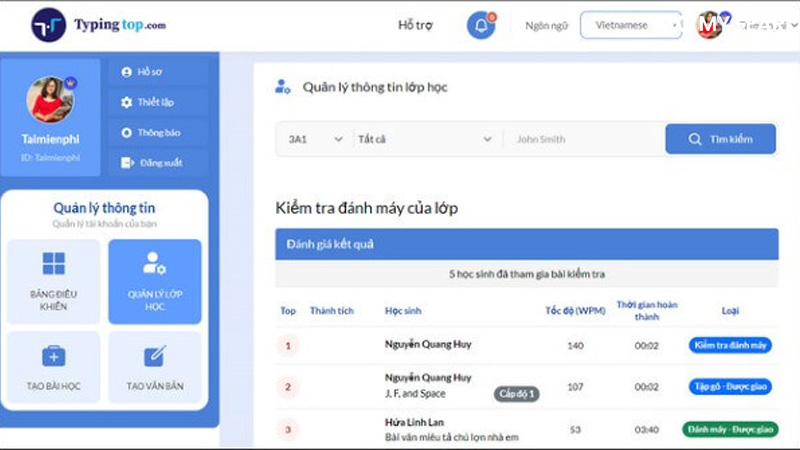 Typingtop.com là phần mềm luyện gõ 10 ngón tiếng Việt hoạt động hoàn toàn online, không cần tải về máy. Người dùng có thể luyện gõ, kiểm tra tốc độ đánh máy và theo dõi tiến trình học tập một cách chi tiết. Giáo viên cũng có thể tạo bài tập riêng để quản lý việc luyện gõ của học sinh. Phần mềm phù hợp cho học sinh, sinh viên và người mới bắt đầu. Giao diện đơn giản, dễ sử dụng.