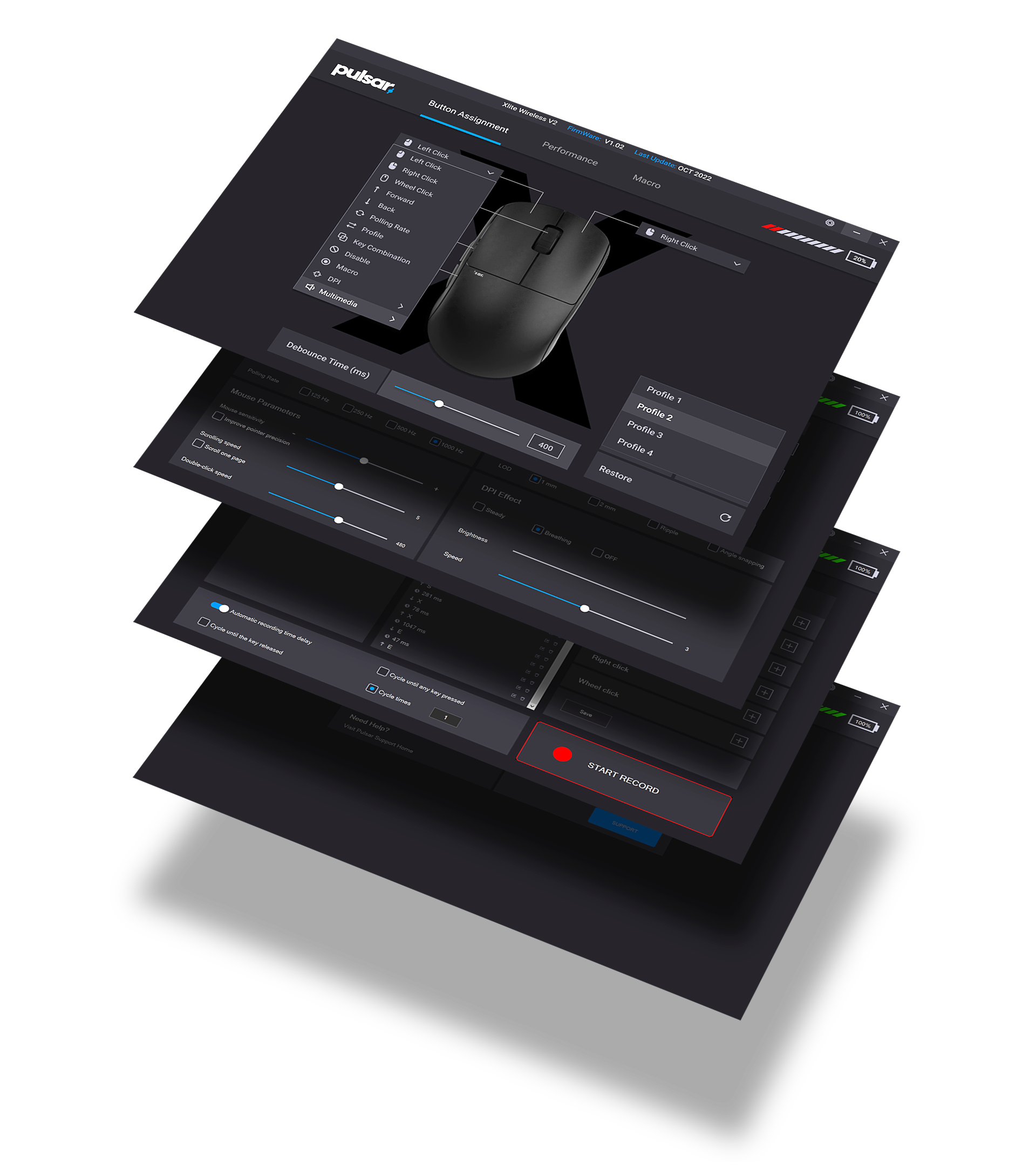 Phần mềm đi kèm với Pulsar X2A Wireless cho phép người dùng tùy chỉnh các nút bấm, DPI và các chế độ khác nhau theo sở thích cá nhân.