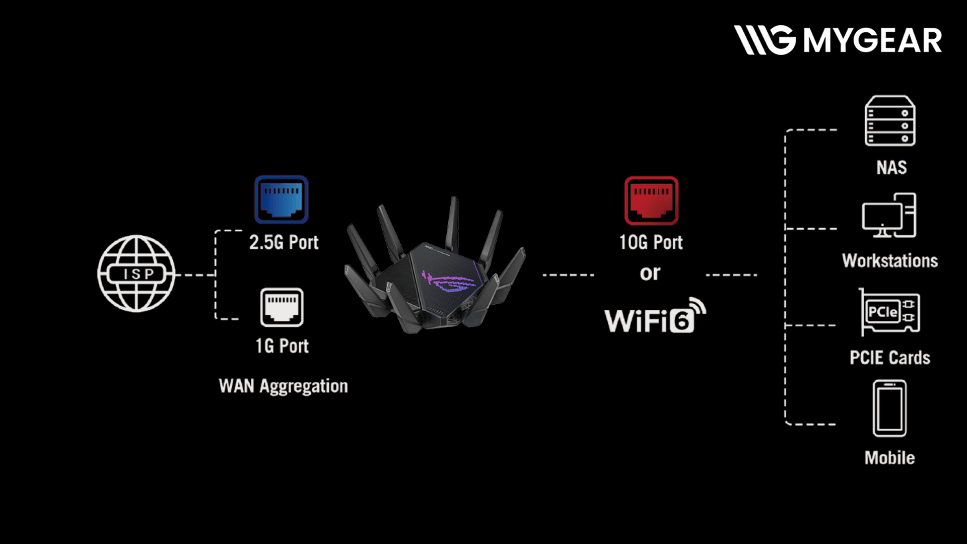 ASUS ROG AX11000 PRO hỗ trợ công nghệ AiMesh, cho phép bạn kết nối nhiều router ASUS lại với nhau để tạo thành mạng lưới WiFi đồng bộ trong toàn bộ ngôi nhà. Điều này giúp tín hiệu WiFi mạnh mẽ, liền mạch và ổn định dù bạn ở phòng khách, phòng làm việc hay tầng lầu. Với ASUS router gaming AiMesh, bạn có thể dễ dàng mở rộng hệ thống WiFi mà không cần thay thế thiết bị hiện có, tiết kiệm chi phí và thời gian cài đặt.