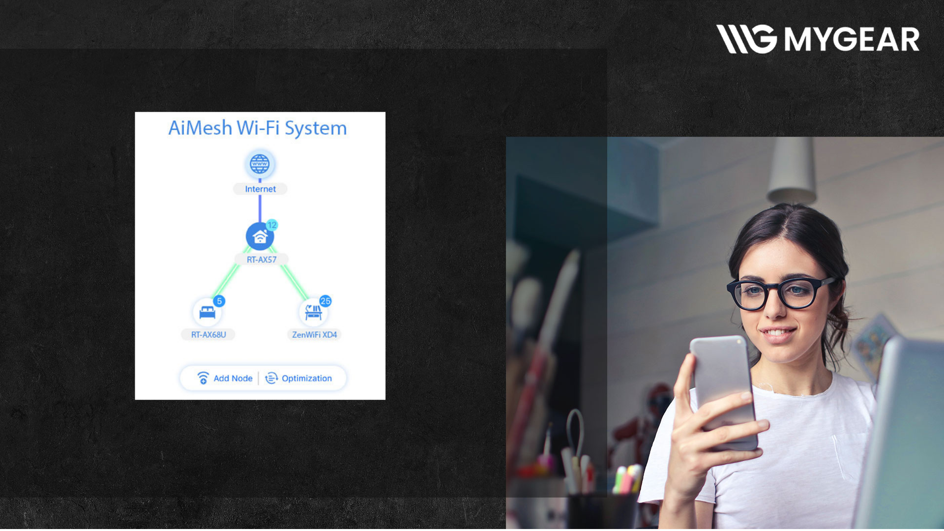 Điểm nổi bật khác của router mesh ASUS RT-AX57 là khả năng kết nối linh hoạt với các router ASUS khác qua tính năng AiMesh, giúp mở rộng phạm vi phủ sóng mà không cần thay thế thiết bị cũ. Chỉ với vài bước cấu hình đơn giản, bạn có thể tạo ra một mạng WiFi Mesh thống nhất, mạnh mẽ và liền mạch khắp ngôi nhà hoặc văn phòng. Đây là giải pháp đặc biệt phù hợp cho nhà nhiều tầng hoặc khu vực có nhiều vật cản, nơi mà tín hiệu WiFi truyền thống dễ bị suy giảm.