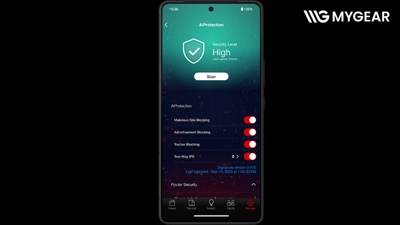 Router ASUS 4 băng tần Rapture GT-BE19000AI được tích hợp AiProtection Pro, hệ thống bảo mật mạng tiên tiến phát triển bởi Trend Micro. Tính năng bảo vệ thiết bị khỏi tấn công mạng, chặn truy cập nguy hiểm, đồng thời cung cấp công cụ quản lý trẻ nhỏ giúp kiểm soát thời gian và nội dung truy cập Internet.