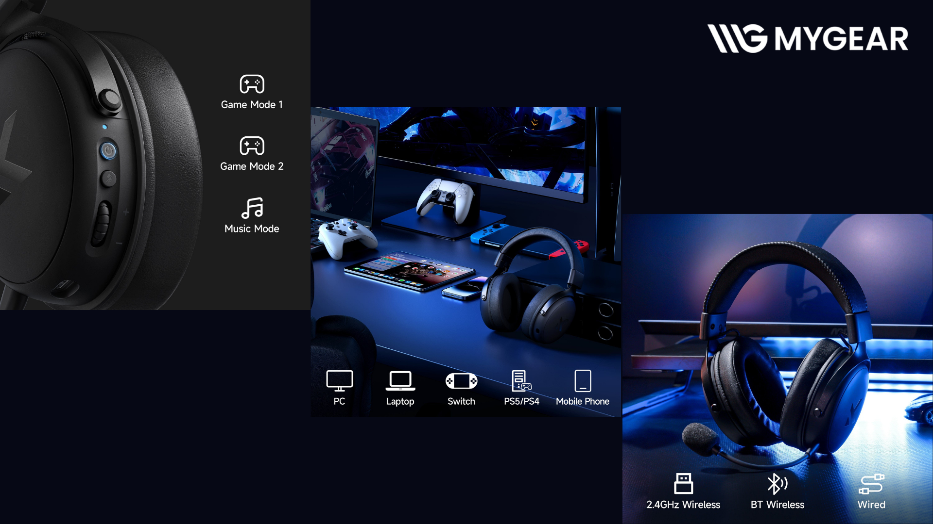Tai nghe Mchose V9 Pro hỗ trợ kết nối Tri-mode gồm 2.4GHz wireless, Bluetooth và USB wired. Điều này giúp người dùng dễ dàng chuyển đổi giữa nhiều thiết bị như PC, laptop, console hoặc điện thoại mà không cần thay đổi tai nghe. Nhờ khả năng kết nối đa dạng, tai nghe không dây Mchose có thể sử dụng linh hoạt cho cả gaming, làm việc và giải trí hằng ngày.