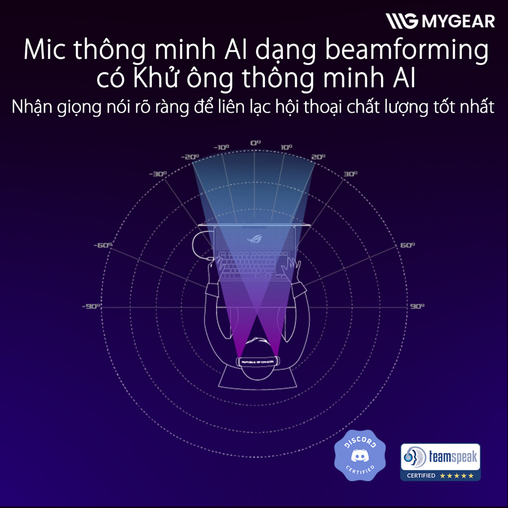 Tai nghe Gaming ASUS ROG Fusion II 300 sử dụng micro omnidirectional thu âm giọng nói rõ ràng, độ nhạy -37 dB, dải tần 100Hz – 10kHz. Micro tích hợp AI khử ồn, giúp lọc bỏ tiếng ồn xung quanh, đảm bảo giao tiếp trong game hoặc họp trực tuyến luôn rõ ràng và chính xác.