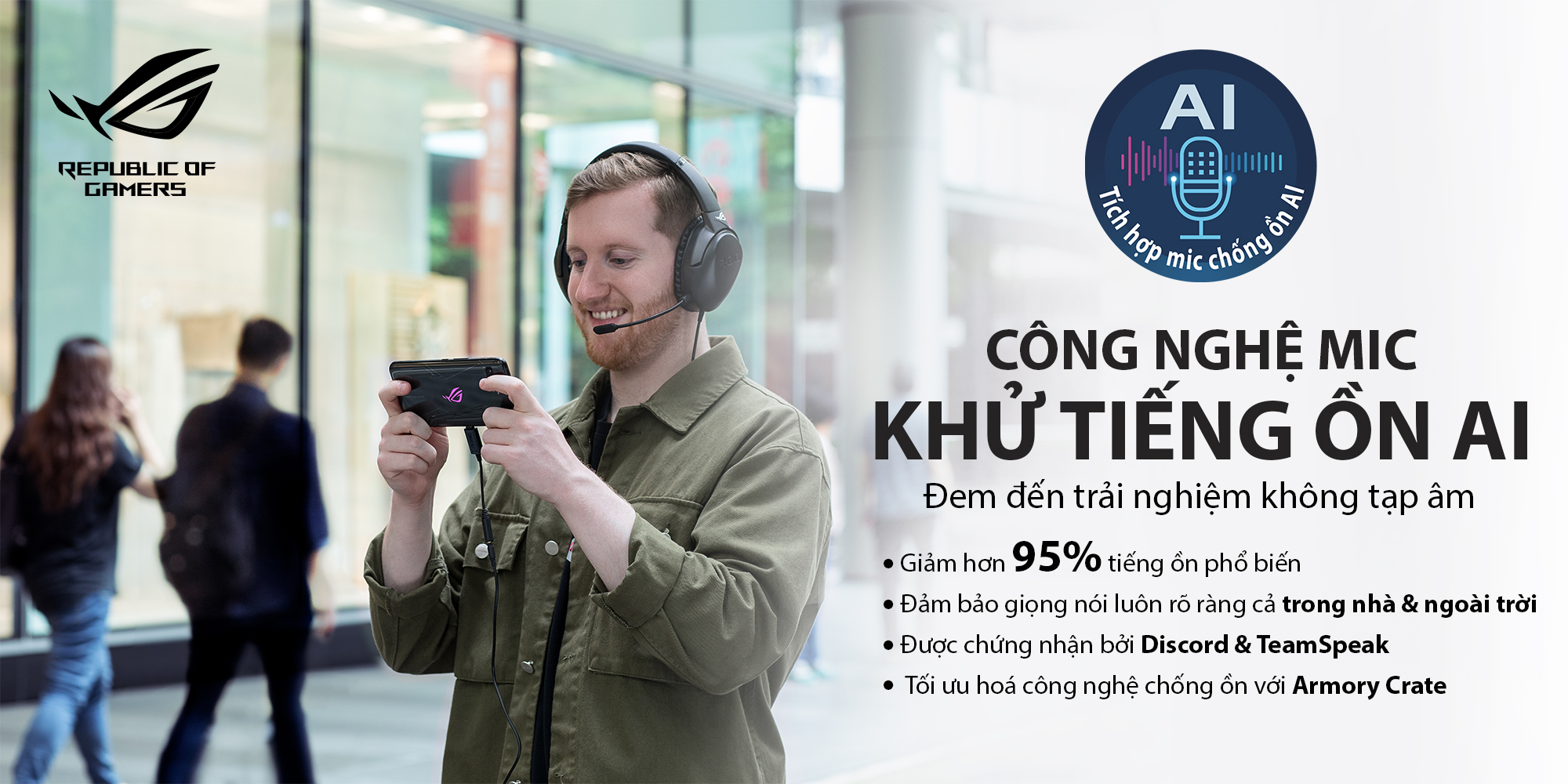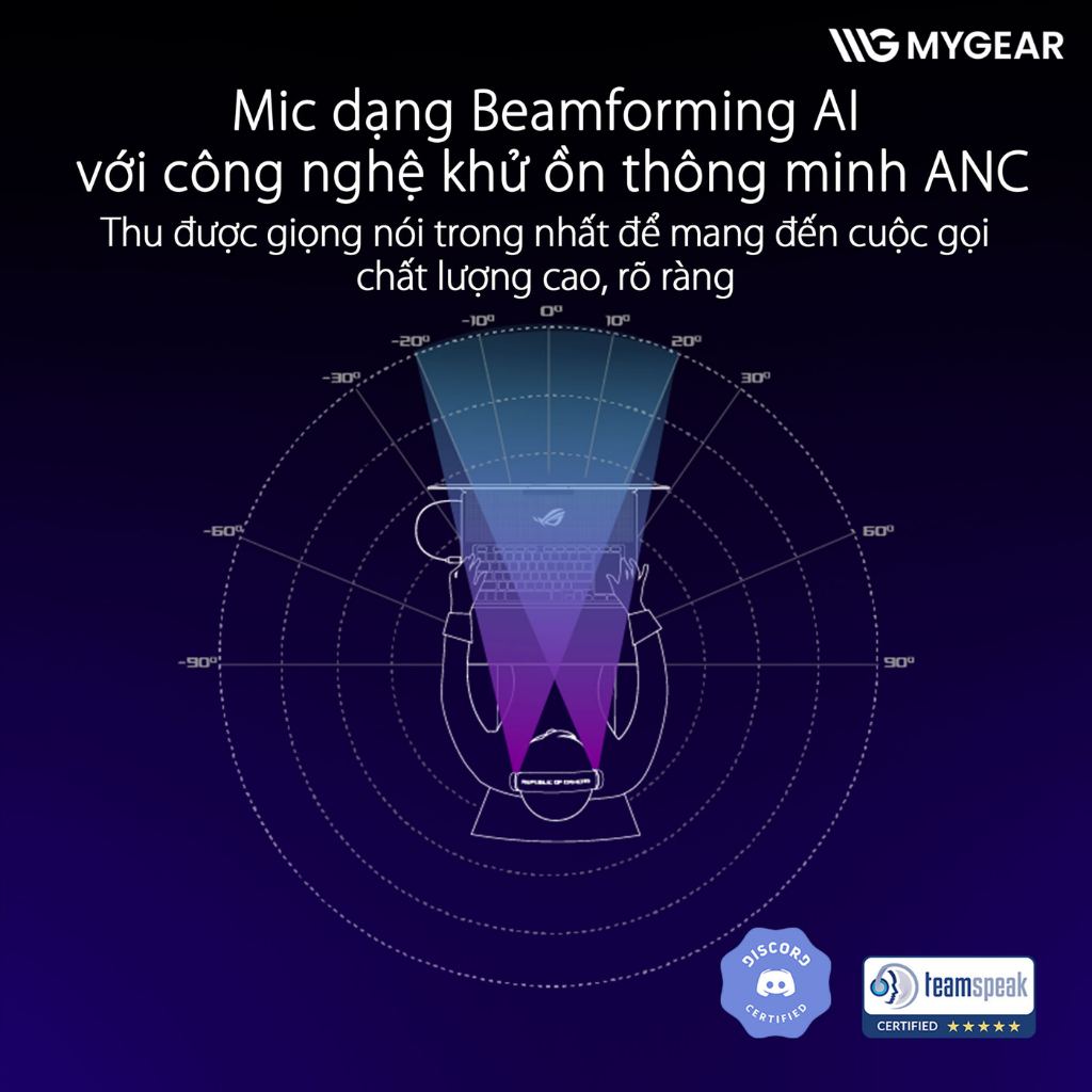 Tai nghe Overear ROG Fusion II 500 sử dụng micro Omnidirectional với độ nhạy -37 dB, dải tần 100Hz – 10kHz, kết hợp khử ồn AI, giúp lọc bỏ tiếng ồn xung quanh, đảm bảo giao tiếp rõ ràng khi chơi game hoặc họp trực tuyến.