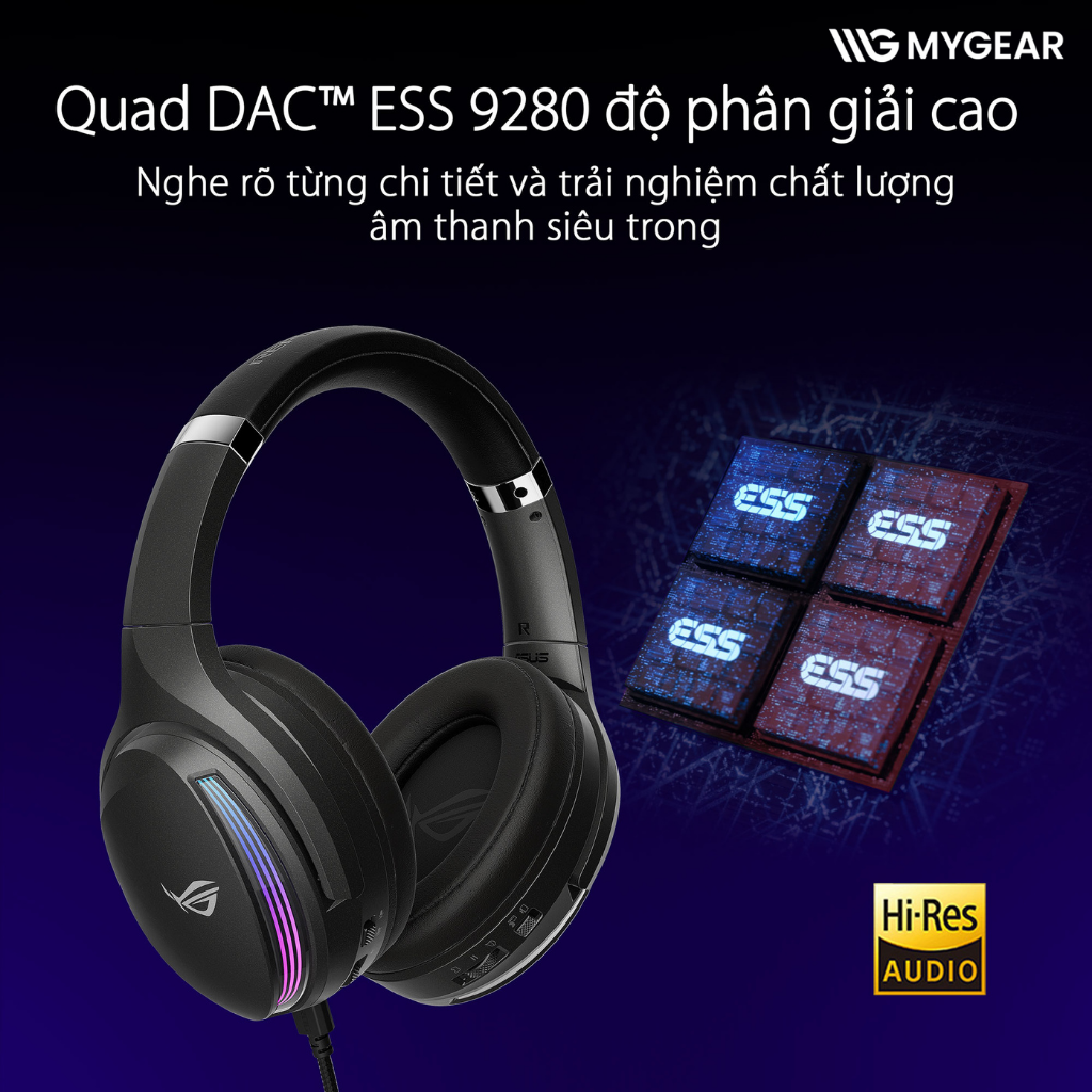 Hệ thống DAC và Amp ESS 9280 Hi-Fi trong headset gaming ROG Fusion II 500 xử lý âm thanh kỹ thuật số một cách mượt mà, giảm nhiễu, tăng độ chi tiết và âm trầm mạnh mẽ, đem đến trải nghiệm âm thanh cao cấp.