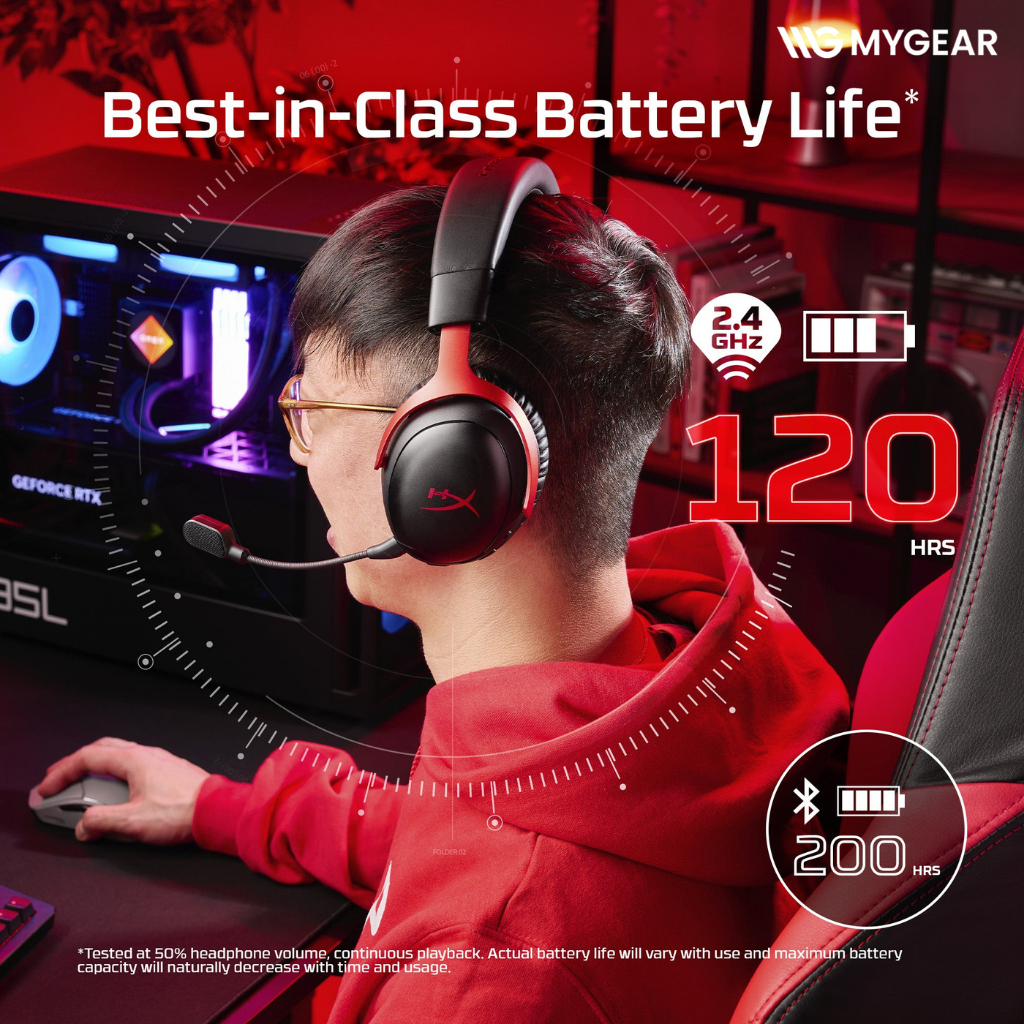 Một trong những điểm nổi bật của tai nghe gaming không dây HyperX là thời lượng pin. HyperX Cloud III S Wireless cung cấp 120 giờ hoạt động ở chế độ 2.4GHz và 200 giờ khi sử dụng Bluetooth, giúp bạn yên tâm chơi game nhiều ngày liên tục mà không lo sạc pin.