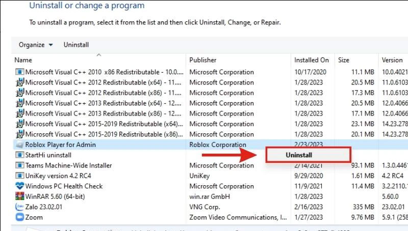 - Bước 2: Tìm Roblox → chuột phải → Uninstall