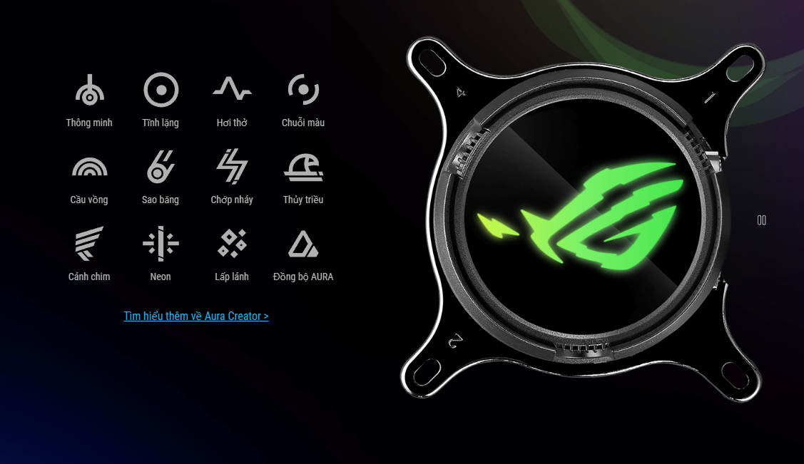 Chiếu sáng rực rỡNâng cao dàn máy chơi game của bạn với nhiều hiệu ứng ánh sáng Aura để tạo ra cảnh tượng đầy màu sắc. Chế độ thông minh còn tiến xa hơn nữa với ánh sáng động để trực quan hóa các tải phần cứng khác nhau. Và với sự hỗ trợ của Aura Creator, bạn có thể điều chỉnh các hiệu ứng ánh sáng độc đáo của riêng mình, khiến thiết lập của bạn thực sự có một không hai.