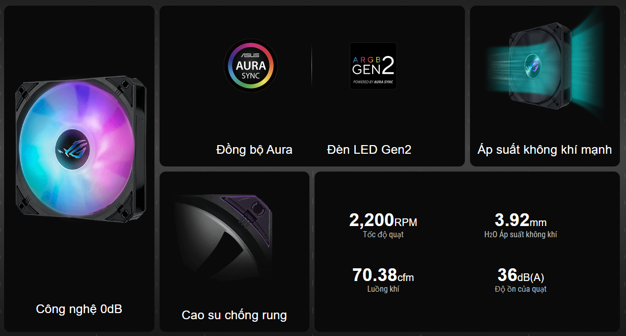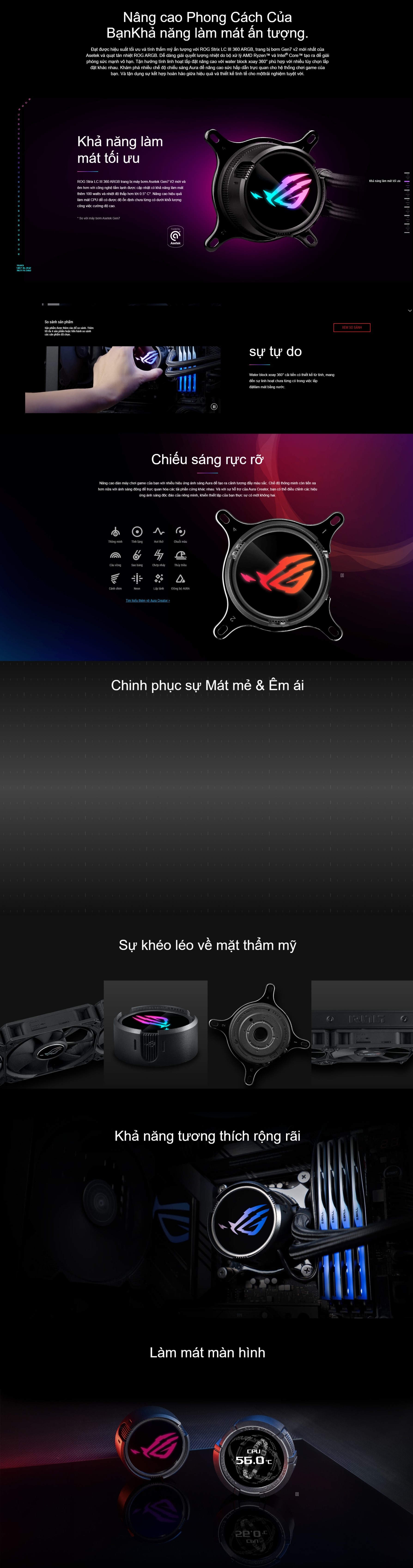 Nâng cao Phong Cách Của BạnKhả năng làm mát ấn tượng.Đạt được hiệu suất tối ưu và tính thẩm mỹ ấn tượng với ROG Strix LC III 360 ARGB , trang bị bơm Gen7 v2 mới nhất của Asetek và quạt tản nhiệt ROG ARGB. Dễ dàng giải quyết lượng nhiệt do bộ xử lý AMD Ryzen™ và Intel® Core™ tạo ra để giải phóng sức mạnh vô hạn. Tận hưởng tính linh hoạt lắp đặt nâng cao với water block xoay 360° phù hợp với nhiều tùy chọn lắp đặt khác nhau. Khám phá nhiều chế độ chiếu sáng Aura để nâng cao sức hấp dẫn trực quan cho hệ thống chơi game của bạn. Và tận dụng sự kết hợp hoàn hảo giữa hiệu quả và thiết kế tinh tế cho mộttrải nghiệm tuyệt vời.