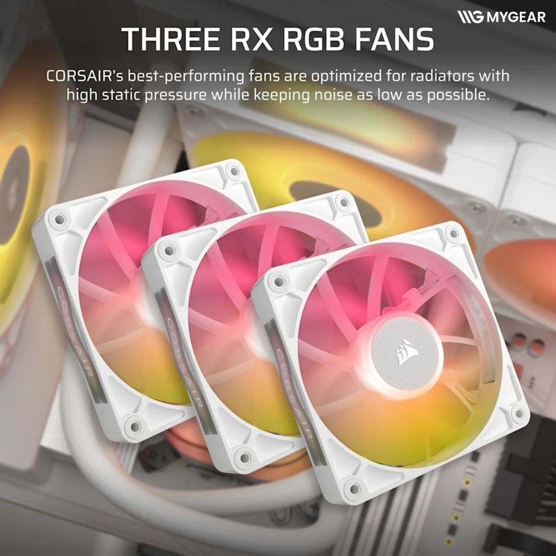 Là sản phẩm hàng đầu thuộc dòng tản nhiệt AIO 360mm, Corsair TITAN 360 RX LCD White trang bị radiator kích thước lớn 360mm cùng 3 quạt hiệu suất cao 120mm. Bộ quạt sử dụng vòng bi từ tính (Magnetic Levitation) giúp tăng cường lưu lượng gió, giảm thiểu tiếng ồn và đảm bảo nhiệt độ luôn duy trì ổn định, kể cả khi CPU hoạt động ở mức tải nặng hoặc ép xung.
