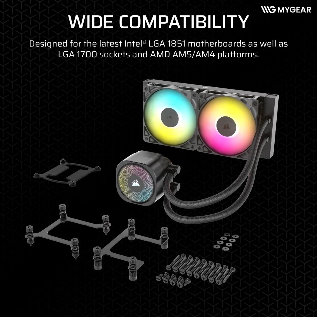 Corsair Nautilus 240 RS ARGB hỗ trợ hầu hết các socket CPU phổ biến hiện nay bao gồm Intel LGA 1700, 1851 và AMD AM5, AM4. Nhờ đó, bạn có thể dễ dàng lắp đặt tản vào các hệ thống mới nhất sử dụng vi xử lý CPU Intel Gen 12/13/14 hoặc CPU AMD Ryzen 5000/7000 mà không cần mua thêm phụ kiện. Đây là ưu điểm lớn giúp tiết kiệm thời gian, chi phí khi nâng cấp.