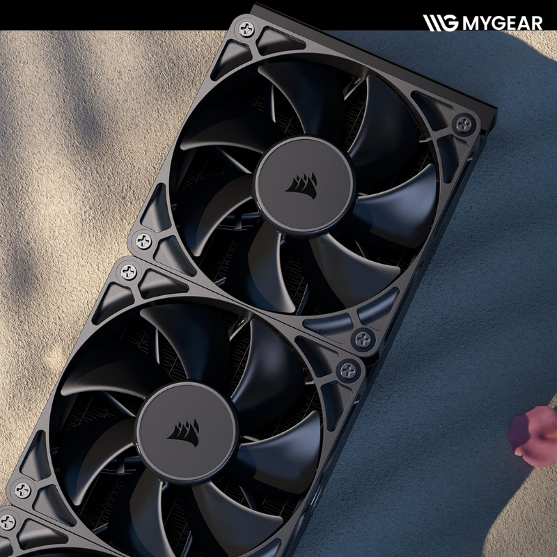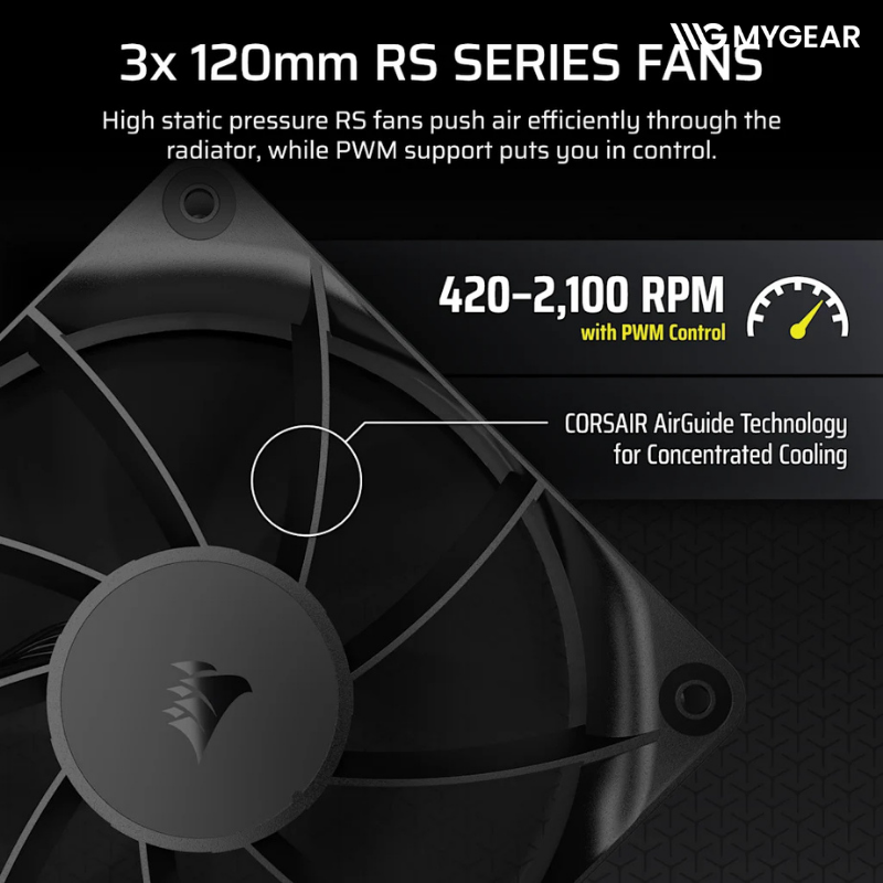 Corsair NAUTILUS 360 RS LCD Black được trang bị 3 quạt RS120, dải tốc độ từ 420 đến 2100 RPM ±10%, cho lưu lượng gió 13.3 – 72.8 CFM và áp suất tĩnh 0.2 – 4.15 mm-H2O. Đây là thông số lý tưởng cho radiator dày 27mm, đảm bảo luồng khí xuyên qua các lá tản hiệu quả ngay cả khi chạy ở tốc độ trung bình.