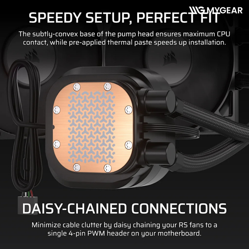 Phần tiếp xúc CPU của CW-9061033-WW được làm từ đồng nguyên khối, đảm bảo khả năng dẫn nhiệt nhanh và ổn định. Nhờ đó, nhiệt lượng từ IHS của CPU được truyền trực tiếp vào hệ thống chất lỏng, giảm độ trễ nhiệt trong các tình huống tải nặng. Sự kết hợp giữa plate đồng và radiator nhôm giúp tản nhiệt nước Corsair duy trì hiệu suất lâu dài, đồng thời hạn chế hiện tượng quá nhiệt đột ngột khi CPU tăng xung.