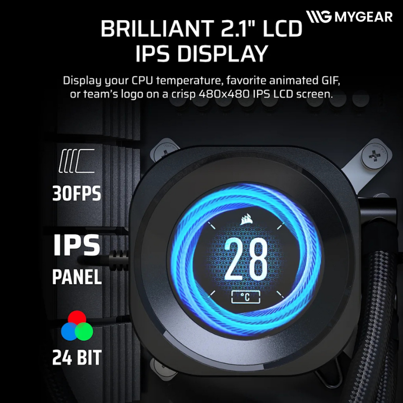 Điểm nhấn của Corsair LCD cooler NAUTILUS 360 RS nằm ở màn hình IPS 2.1 inch với độ phân giải 480 x 480, độ sáng 600cd/m², tần số hiển thị 30 FPS và khả năng hiển thị 16.7 triệu màu. Màn hình cho hình ảnh rõ nét, góc nhìn rộng và màu sắc chính xác, giúp hiển thị thông số nhiệt độ CPU, tốc độ quạt, logo hoặc hình ảnh tùy chỉnh.