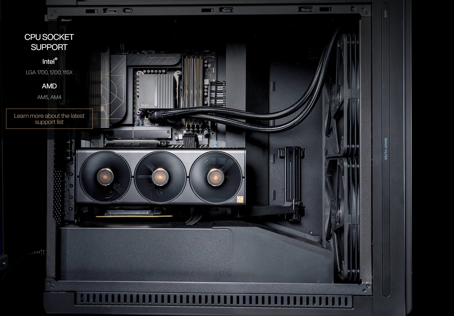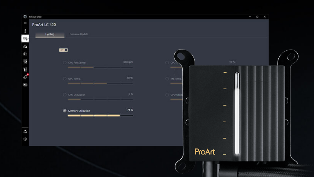 Trải nghiệm hiệu suất làm mát tuyệt vời và hoạt động yên tĩnh. Được trang bị động cơ ba pha hiệu suất và quạt Noctua IndustrialPPC, ProArt LC 420 tích hợp công nghệ cao cấp một cách chuyên nghiệp vào một thiết kế trang nhã, tinh tế. Đồng hồ đo được chiếu sáng trên nắp máy bơm cũng cung cấp số liệu thống kê trực tiếp của hệ thống theo cách ProArt tối giản đặc trưng để xem nhanh thông tin theo thời gian thực. Và tính thẩm mỹ tinh tế và duyên dáng của nó tạo thêm nét tinh tế cho thiết lập của bạn. Mát mẻ, yên tĩnh và sang trọng—bộ ba hoàn hảo dành cho bất kỳ và tất cả người sáng tạo nội dung.