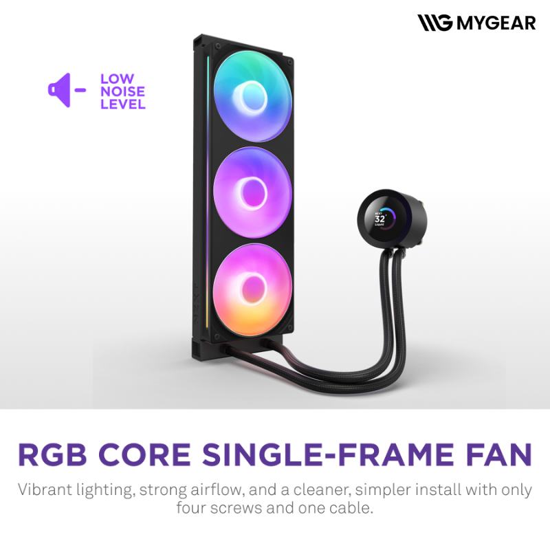 Tản nhiệt đi kèm 3 quạt F120 RGB cao cấp, tốc độ quay từ 500 – 1800 RPM, cho luồng gió mạnh và áp suất tĩnh tối ưu. Hệ thống đèn RGB mềm mượt, có thể đồng bộ hoàn toàn với đầu bơm và các linh kiện NZXT khác thông qua NZXT CAM. Sự kết hợp giữa hiệu năng quạt cao và ánh sáng RGB hiện đại tạo nên không gian PC vừa mát mẻ vừa đầy cảm xúc.