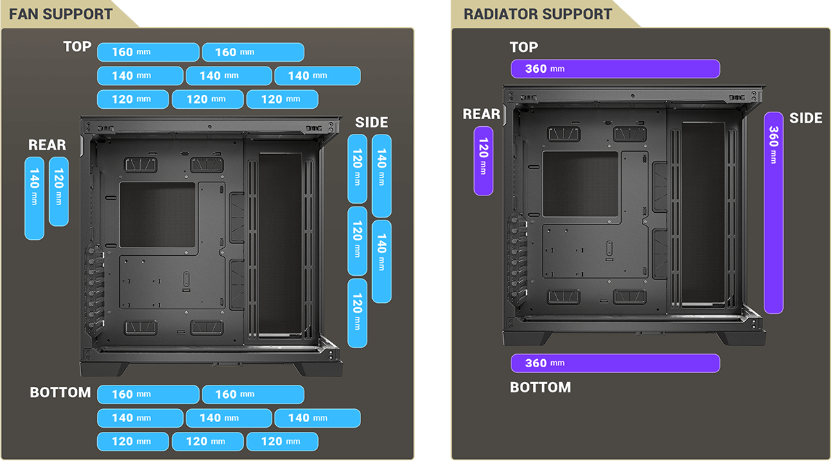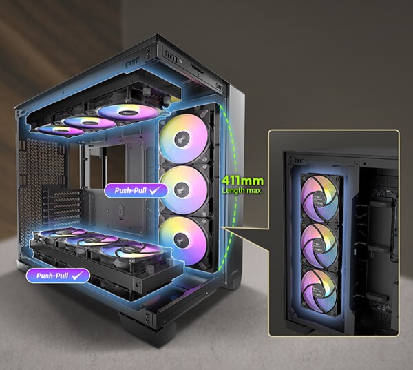Đây là yếu tố then chốt khi bạn muốn build dàn máy cao cấp sử dụng các dòng CPU Intel Core i9, Ryzen 9 hay thậm chí Threadripper mà vẫn đảm bảo hiệu suất làm mát vượt trội. Cấu trúc thông thoáng và khung quạt hỗ trợ tối đa 10 fan giúp hệ thống luôn hoạt động mát mẻ và êm ái.