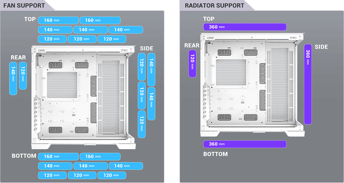 | Hỗ trợ quạt (dưới) | 3×120mm / 3×140mm / 2×160mm |