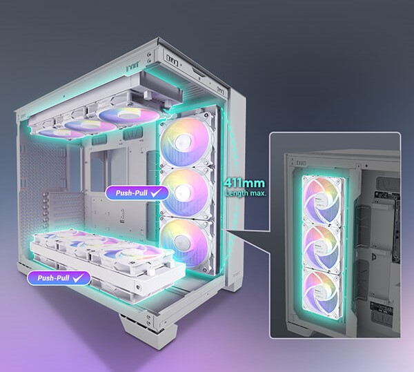 Antec C8 White được trang bị hệ thống thông gió thông minh với khả năng lắp tới 3 quạt 120mm/3 quạt 140mm phía dưới, 3 quạt 120mm/2 quạt 140mm bên hông, 3 quạt 120mm trên đỉnh, 1 quạt 120mm phía sau và tản nhiệt CPU cao đến 175mm. Đây là nền tảng lý tưởng để xây dựng một PC gaming cao cấp hoặc hệ thống làm việc chuyên nghiệp đòi hỏi tản nhiệt tối ưu và hoạt động ổn định lâu dài.