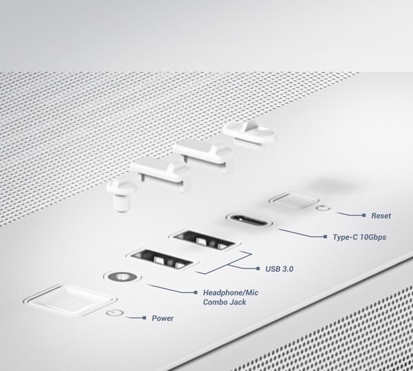 Vỏ case Antec C8 White trang bị các cổng kết nối I/O phía trước bao gồm 2 cổng USB 3.0, 1 cổng USB Type-C, Jack âm thanh 3.5mm và nút power, Reset ở vị trí thuận tiện giúp người dùng dễ dàng truy cập và kết nối thiết bị ngoại vi trong quá trình sử dụng.