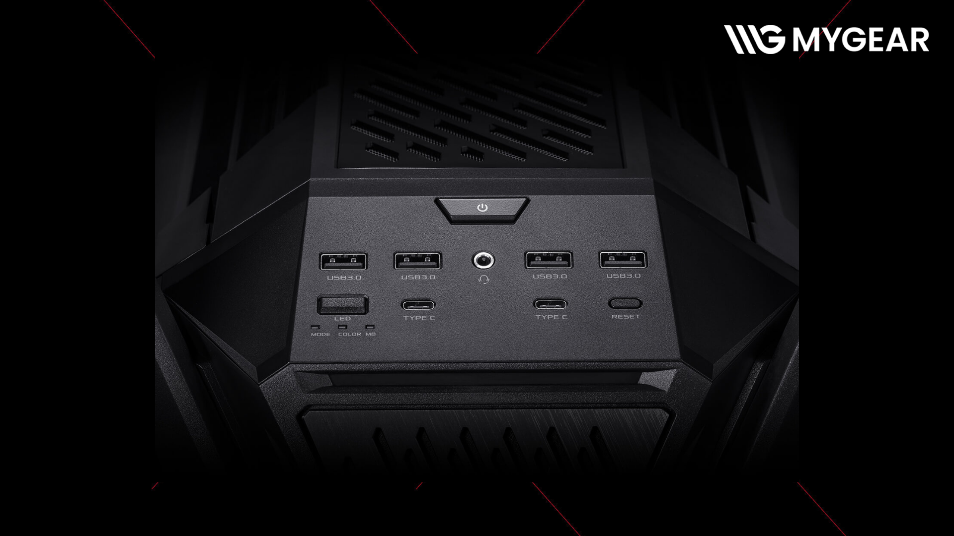 Mặt trước của vỏ case ASUS ROG Hyperion GR701 trang bị 1 cổng Headphone/Mic, 4 cổng USB 3.2 Gen1, 1 cổng USB 3.2 Gen2 Type-C và tùy khu vực có thể có USB 4.0 Type-C hoặc USB 3.2 Gen2x2 Type-C. Ngoài ra còn có nút LED Control và nút Reset giúp điều chỉnh hiệu ứng ánh sáng dễ dàng. Đây là hệ thống I/O cao cấp phù hợp với nhu cầu sử dụng thiết bị ngoại vi hiện đại.