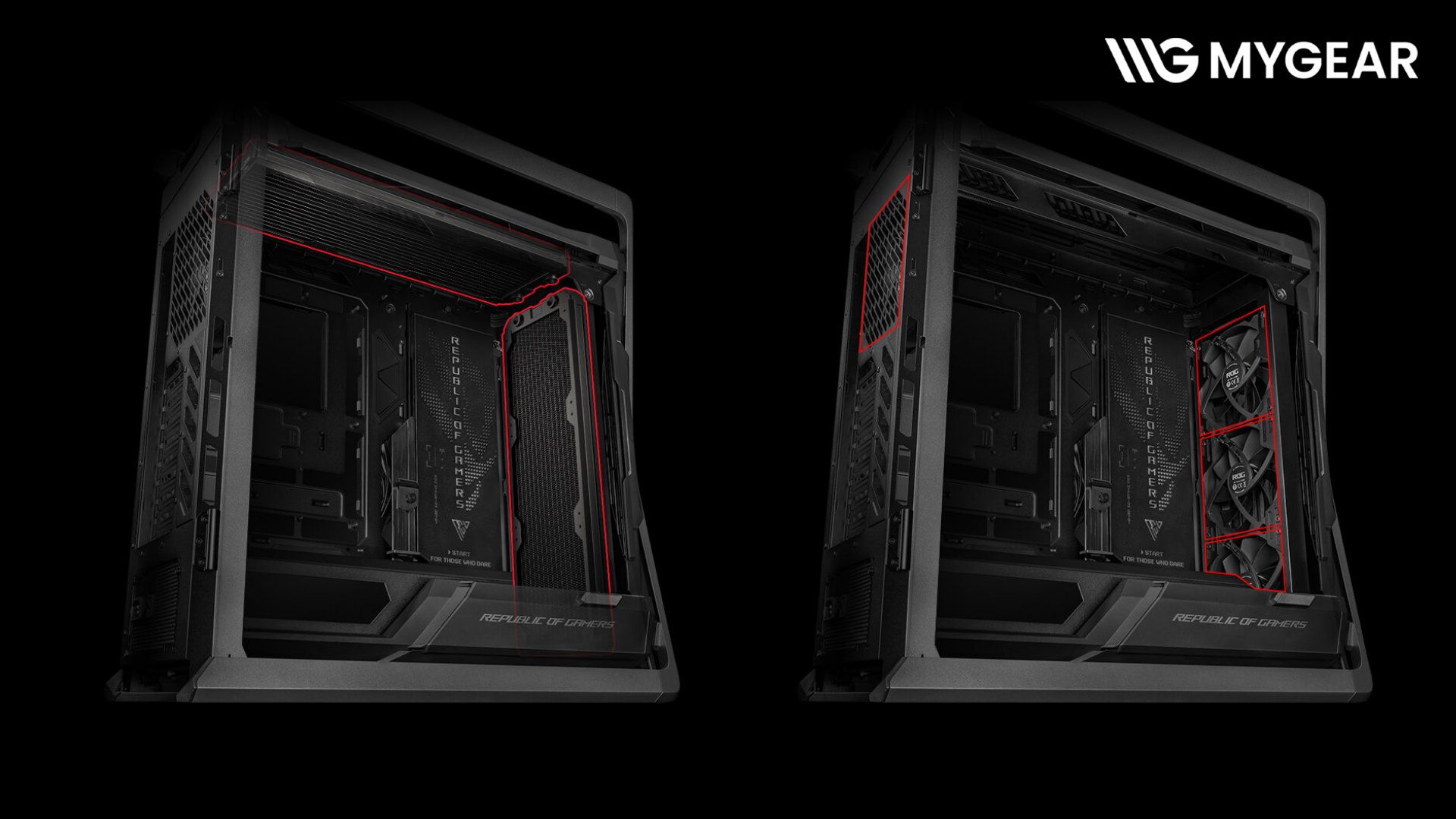 Không chỉ là một vỏ case full tower ASUS, sản phẩm còn được tối ưu cho tản nhiệt nước custom với khả năng hỗ trợ radiator 420mm cả phía trước và phía trên. Điều này giúp Hyperion GR701 trở thành một case ROG cao cấp đúng nghĩa dành cho người dùng yêu cầu cả hiệu năng lẫn thẩm mỹ.