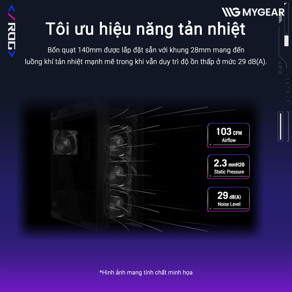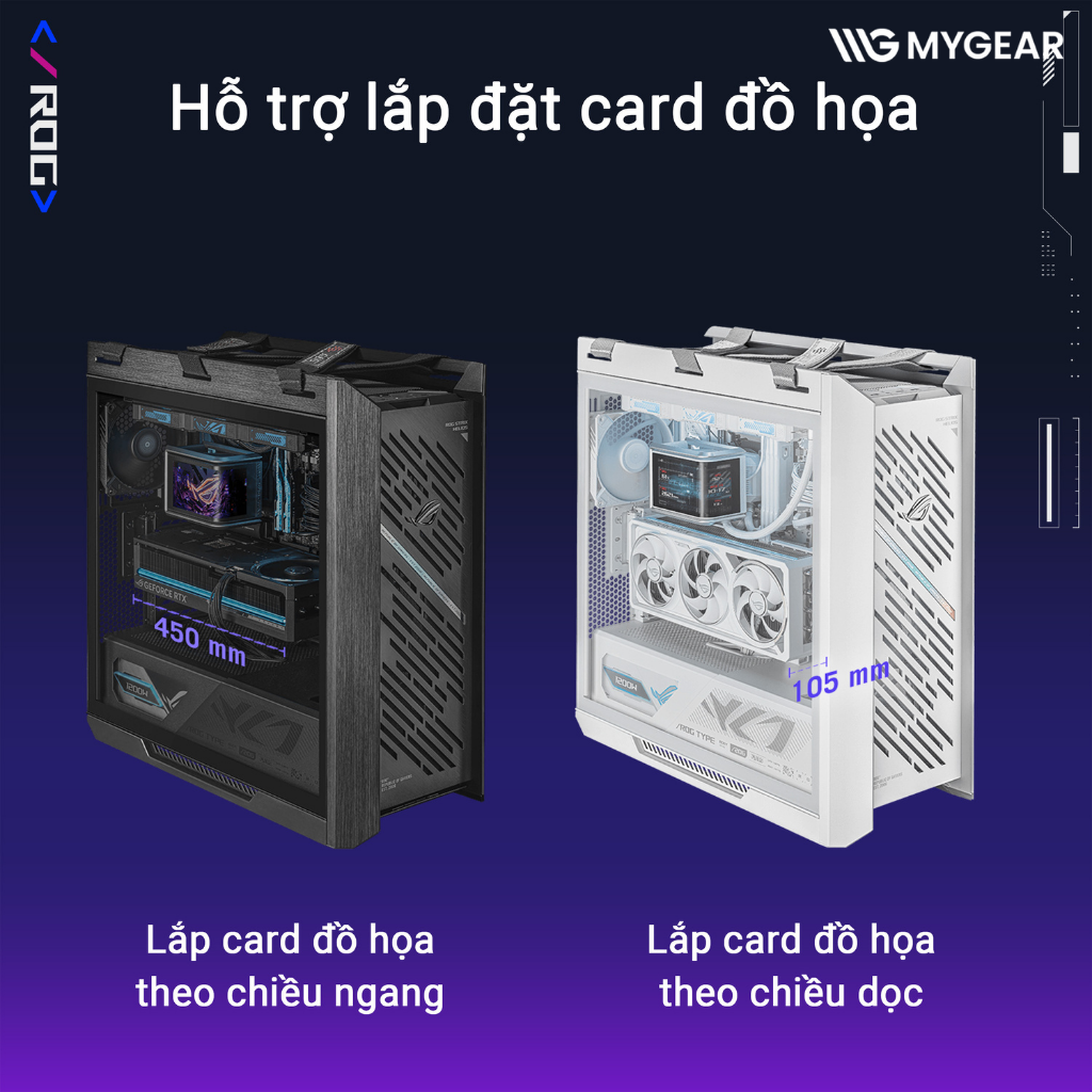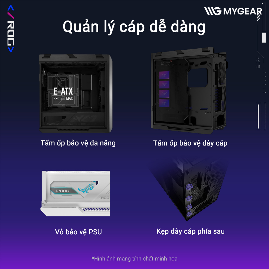 Với khoảng không quản lý cáp 33 mm cùng thiết kế nắp che ốc, dây nối ẩn, bạn có thể bố trí hệ thống dây gọn gàng, tăng tính thẩm mỹ và tối ưu luồng khí làm mát. Đây là điểm cộng lớn khi build PC ROG Strix Helios II White Edition, giúp dàn máy vừa đẹp, vừa hiệu năng cao.