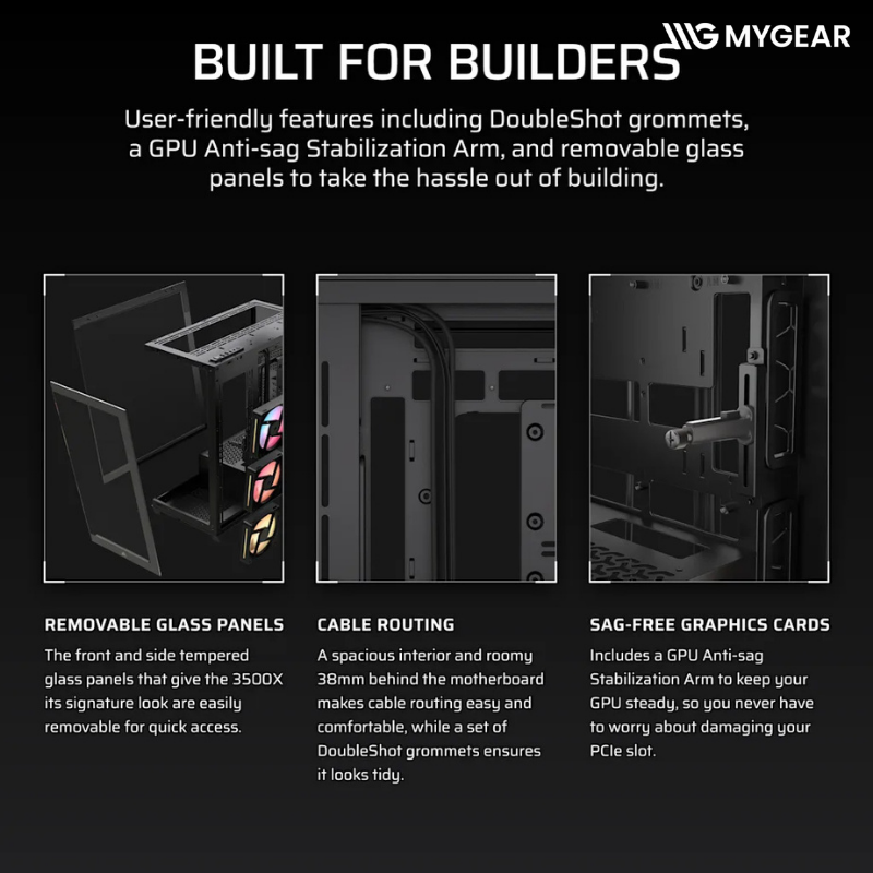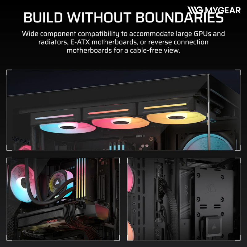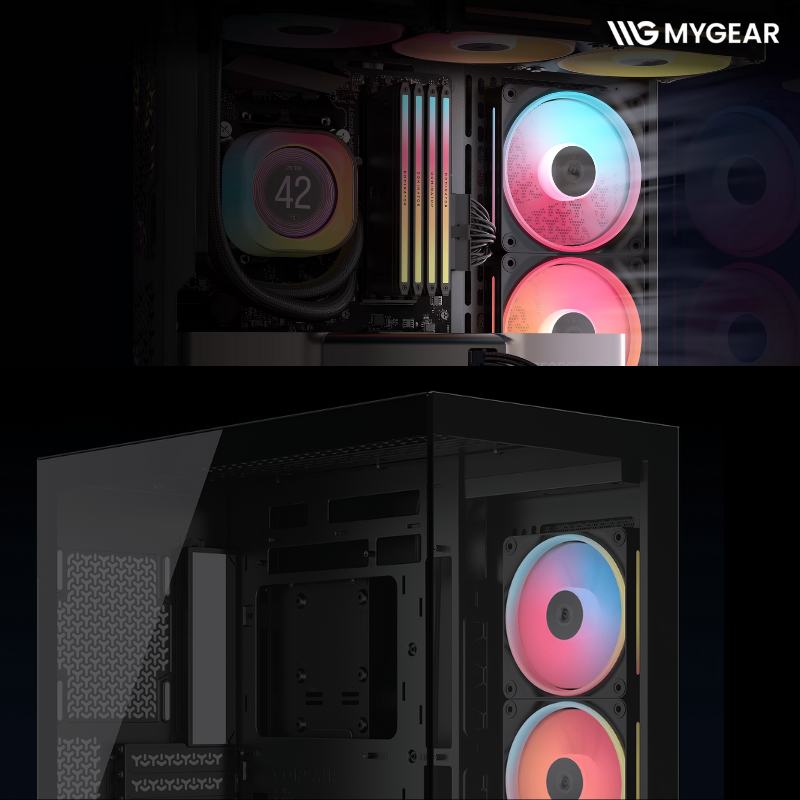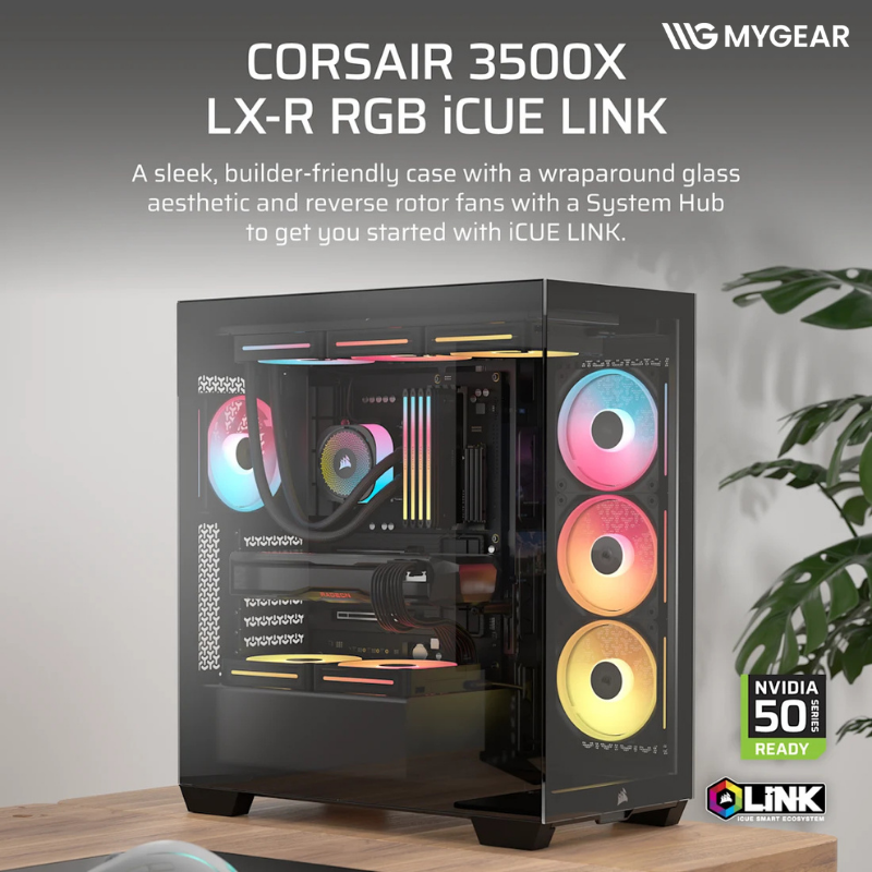 Khi build tại MYGEAR, Corsair 3500X LX-R RGB iCUE LINK Black tương thích hoàn hảo với các linh kiện đang có sẵn như CPU Intel Core i5 i7 i9 và AMD Ryzen 5 Ryzen 7 Ryzen 9, mainboard ATX E-ATX ASUS MSI Gigabyte, card màn hình RTX 5060 RTX 5070 Ti RTX 5080, RAM DDR5 RGB Corsair, SSD NVMe Gen4 Gen5, nguồn Corsair công suất lớn, tản nhiệt nước AIO Corsair 240mm 360mm, fan iCUE LINK, giúp người dùng dễ dàng hoàn thiện một bộ PC gaming hoặc làm việc cao cấp đồng bộ Corsair tại MYGEAR.