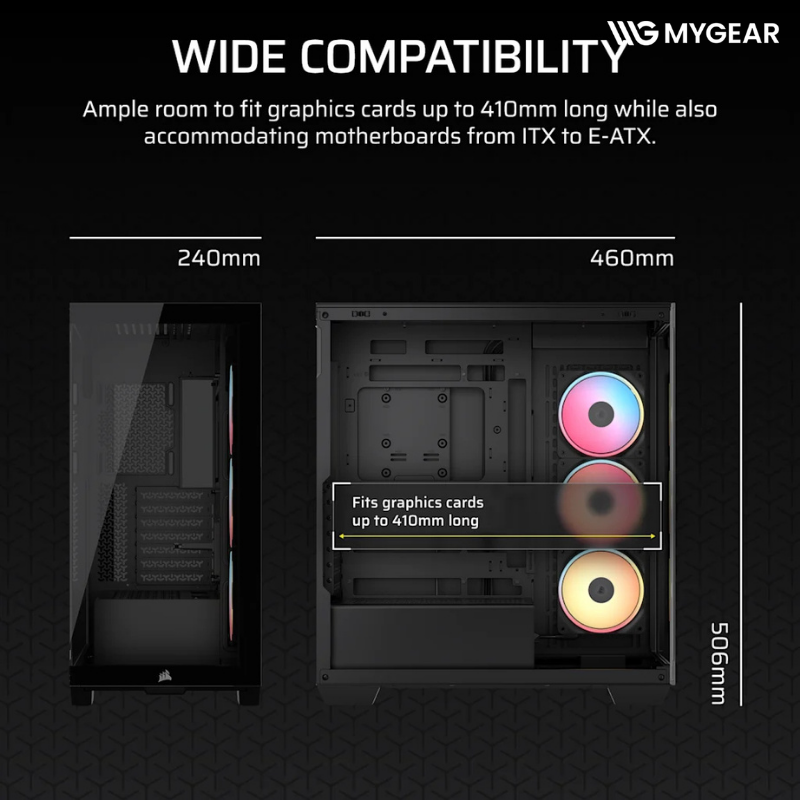 Case Corsair 3500X LX-R RGB tương thích Mini-ITX, Micro-ATX, ATX và E-ATX (305mm x 277mm), mang lại sự linh hoạt tối đa khi lựa chọn mainboard. Đây là điểm cộng lớn cho người dùng nâng cấp cấu hình trong tương lai.