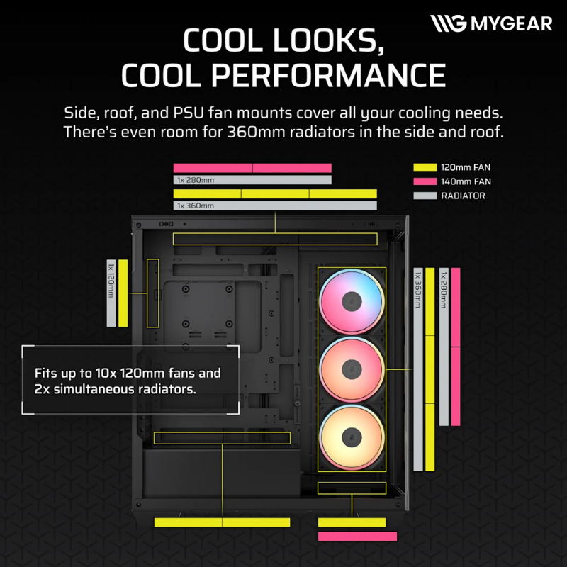 Case hỗ trợ radiator 360mm, 280mm và 240mm ở cả mặt trên và cạnh bên, cùng radiator 120mm phía sau. Điều này giúp Corsair 3500X iCUE LINK đen tương thích tốt với các bộ tản nhiệt nước AIO cao cấp, đảm bảo hiệu năng ổn định cho CPU mạnh.