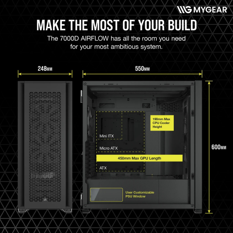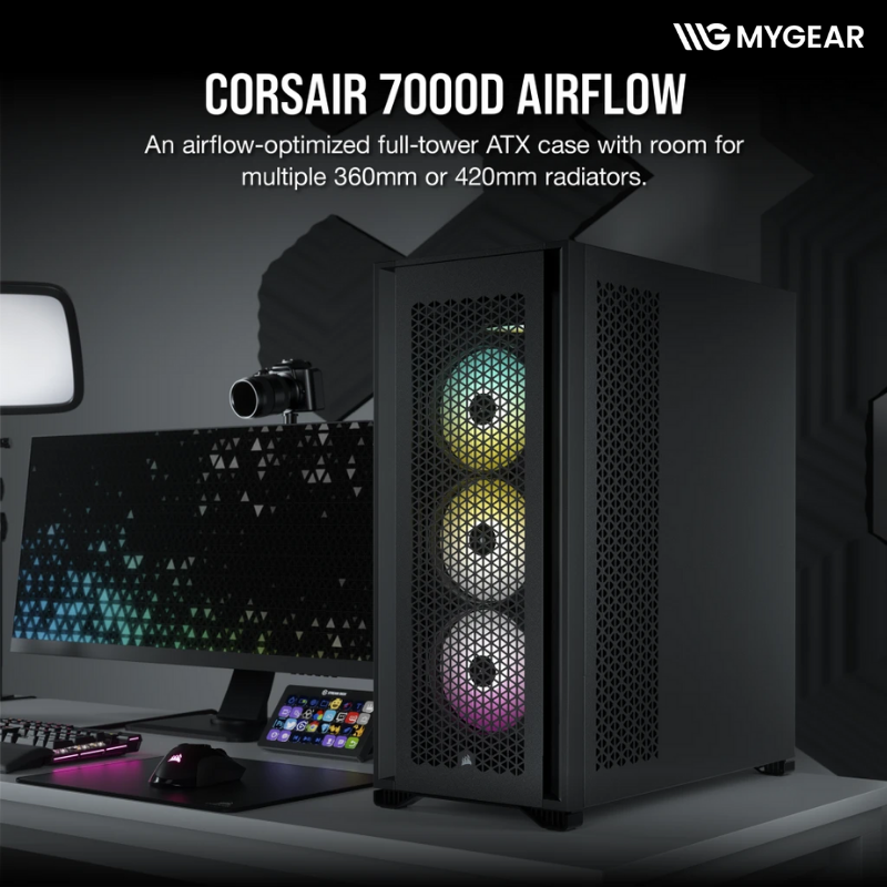 Khi build tại MYGEAR, case máy tính cao cấp Corsair 7000D AIRFLOW CC-9011218-ww tương thích hoàn hảo với các linh kiện đang có sẵn như mainboard ATX E-ATX ASUS MSI Gigabyte, CPU Intel Core i7 i9 và AMD Ryzen 9, card màn hình RTX 4080 RTX 4090, nguồn Corsair công suất lớn, SSD NVMe Gen4, ổ cứng HDD dung lượng cao, tản nhiệt khí cao cấp và tản nước AIO 360mm 420mm 480mm, giúp người dùng dễ dàng build một bộ PC flagship hoặc workstation mạnh mẽ tại MYGEAR.