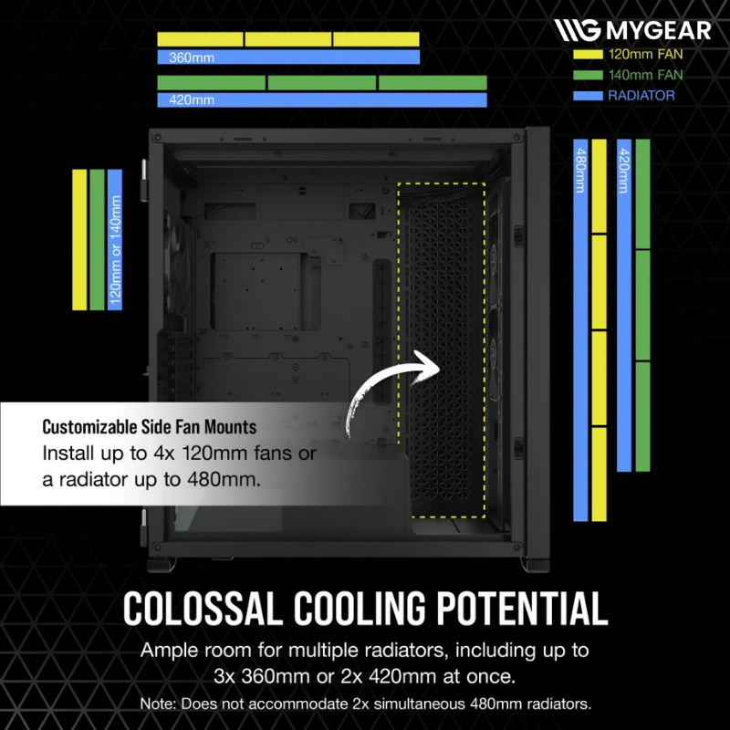 Một trong những điểm mạnh nổi bật của Corsair 7000D Black là khả năng hỗ trợ radiator cực kỳ đa dạng từ 120mm đến 480mm. Điều này giúp người dùng dễ dàng build hệ thống tản nhiệt nước AIO cao cấp hoặc custom loop phức tạp cho cả CPU và GPU mà không gặp trở ngại về không gian. Đây là yếu tố khiến full tower ATX case được nhiều người chơi PC cao cấp lựa chọn.