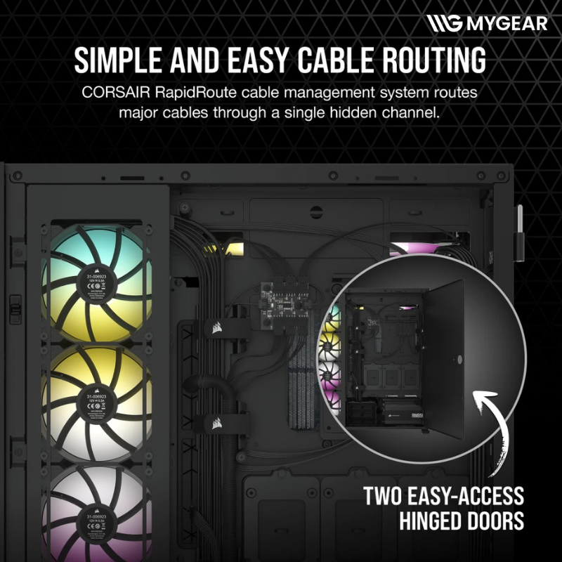 Hệ thống CORSAIR RapidRoute cho phép quản lý cáp với khoảng trống từ 25mm đến 36mm, giúp vỏ case Corsair 7000D AIRFLOW luôn giữ được mặt trước gọn gàng ngay cả khi sử dụng nhiều linh kiện và dây nguồn dày.