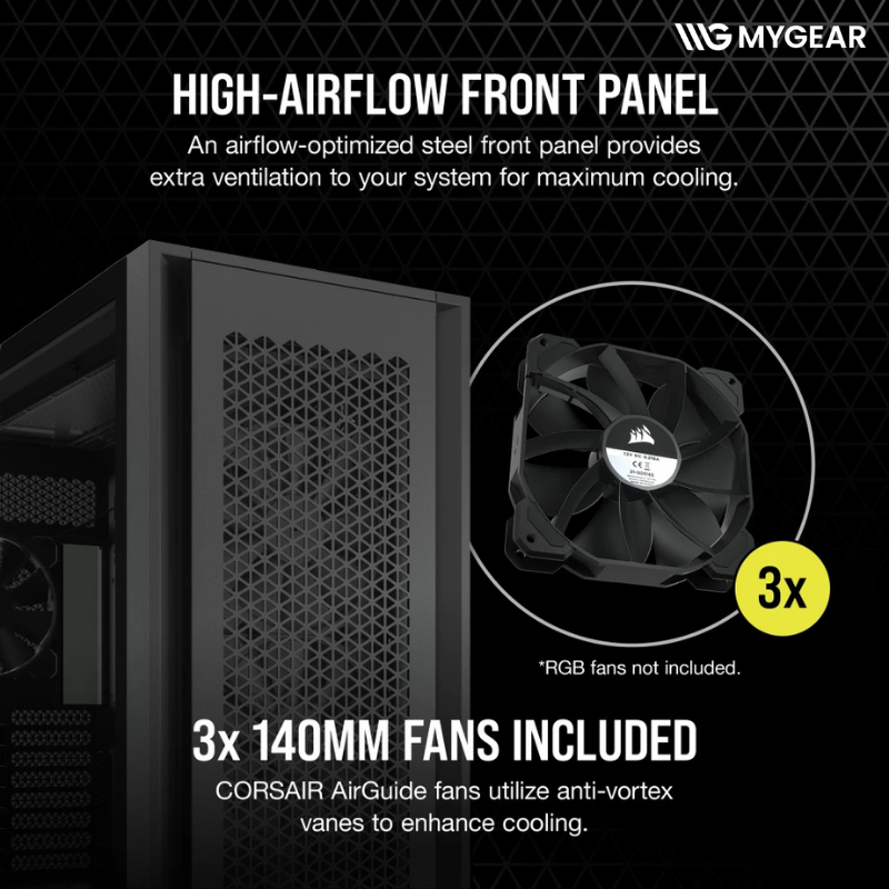 Ngay khi xuất xưởng, vỏ case Corsair 7000D AIRFLOW đã được trang bị 3 quạt AirGuide 140mm, giúp tạo luồng gió tập trung và định hướng tốt hơn đến các linh kiện quan trọng. Quạt 140mm mang lại lưu lượng gió lớn nhưng vẫn giữ độ ồn ở mức dễ chịu, phù hợp cho cả gaming và làm việc chuyên sâu.