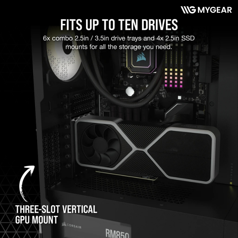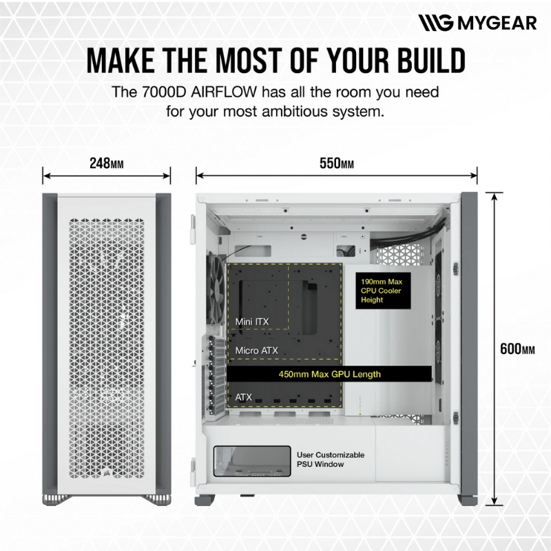 Khi build tại MYGEAR, case máy tính cao cấp Corsair 7000D AIRFLOW CC-9011218-ww tương thích hoàn hảo với các linh kiện đang được phân phối như mainboard ATX E-ATX ASUS MSI Gigabyte, CPU Intel Core i7 i9 và AMD Ryzen 9, card đồ họa RTX 4070 Ti SUPER RTX 4080 RTX 4090, nguồn Corsair công suất lớn, SSD NVMe Gen4, HDD dung lượng cao, tản nhiệt khí cao cấp và tản nhiệt nước AIO 360mm 420mm 480mm, giúp người dùng dễ dàng build hệ thống PC cao cấp đồng bộ tại MYGEAR.