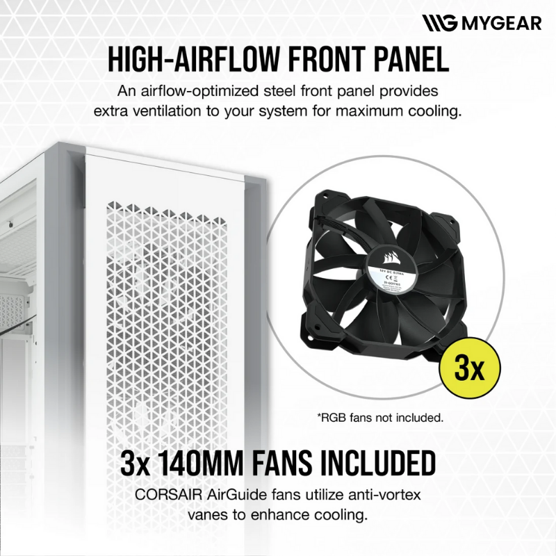 Ngay từ khi xuất xưởng, Corsair 7000D White đã được trang bị 3 quạt AirGuide 140mm, giúp tạo luồng gió tập trung và định hướng chính xác. Quạt 140mm cho lưu lượng gió lớn, vận hành êm ái, rất phù hợp cho những bộ PC cần hiệu năng làm mát cao nhưng vẫn đảm bảo độ yên tĩnh.