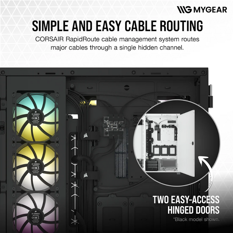 Corsair 7000D White được trang bị hệ thống CORSAIR RapidRoute với khoảng trống đi dây từ 25mm đến 36mm, giúp việc quản lý cáp trở nên gọn gàng ngay cả với cấu hình nhiều linh kiện. Điều này không chỉ giúp thẩm mỹ đẹp hơn mà còn hỗ trợ airflow hiệu quả.