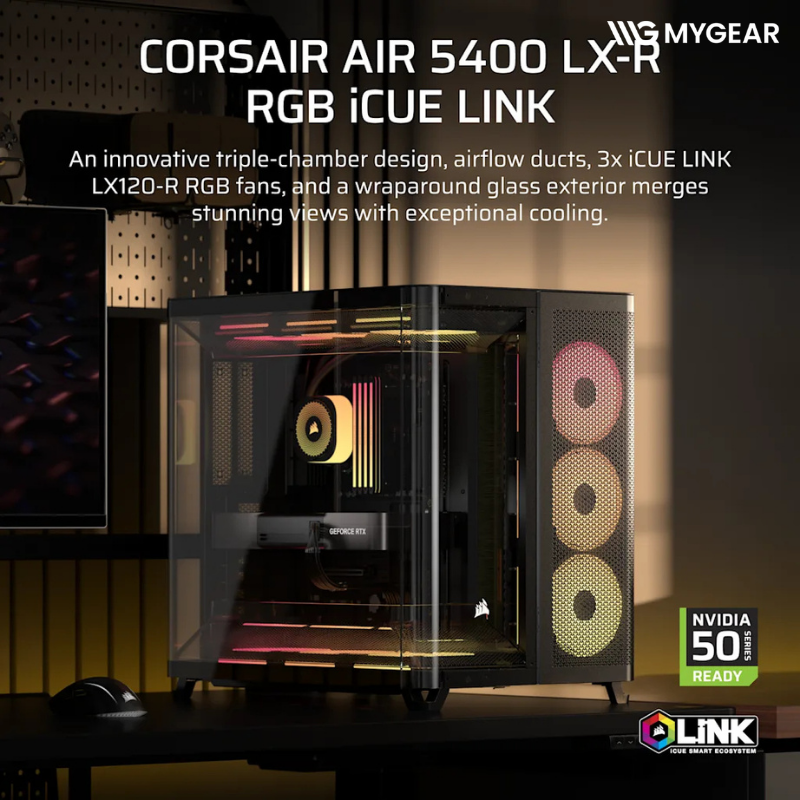Khi build tại MYGEAR, Corsair AIR 5400 LX-R RGB iCUE LINK Black tương thích hoàn hảo với các linh kiện đang có sẵn như mainboard ASUS BTF MSI Project Zero Gigabyte Stealth, CPU Intel Core i7 i9 và AMD Ryzen 7 Ryzen 9, card màn hình RTX 5070 Ti RTX 5080 RTX 5090, nguồn Corsair công suất lớn, SSD NVMe Gen4 Gen5, RAM DDR5 RGB, tản nhiệt nước AIO Corsair 360mm, fan iCUE LINK, giúp người dùng hoàn thiện một bộ PC gaming hoặc workstation cao cấp đồng bộ iCUE LINK tại MYGEAR.