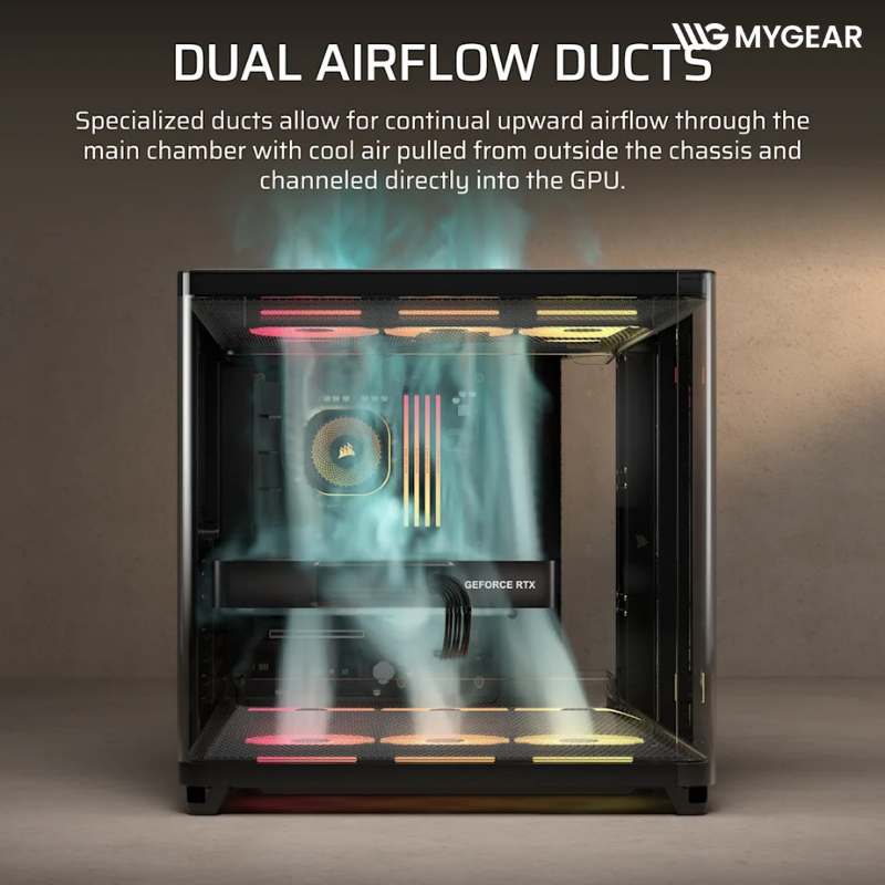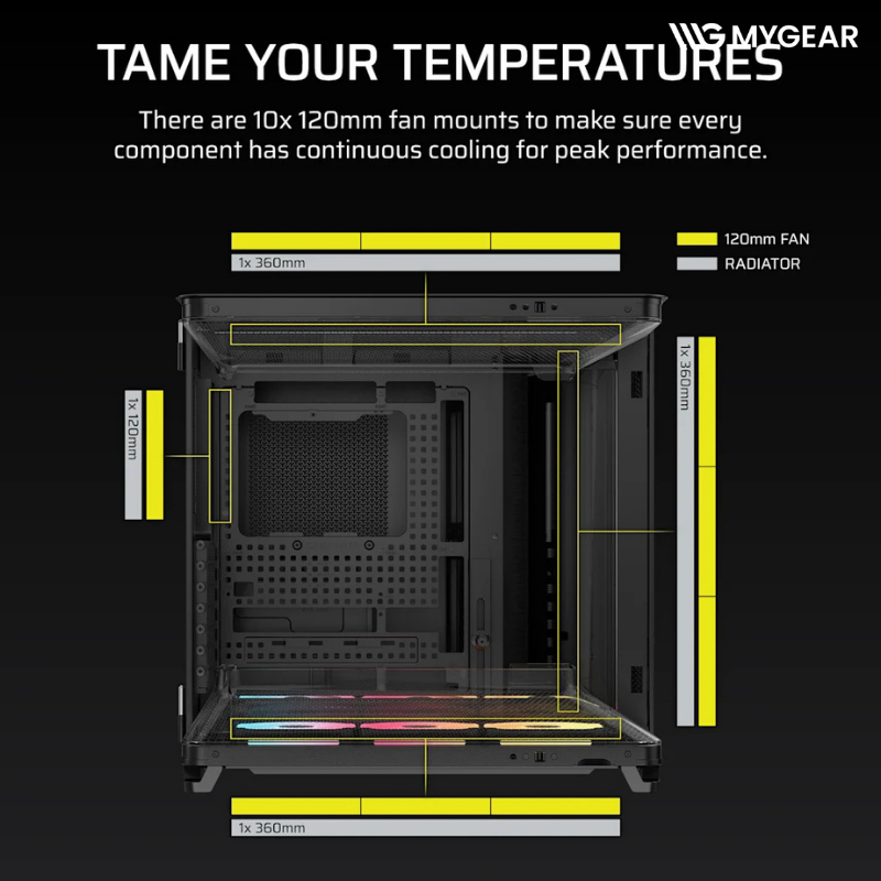 Vỏ case Corsair AIR 5400 LX-R cho phép lắp tối đa 10 quạt 120mm, giúp tạo luồng gió mạnh và ổn định cho toàn bộ hệ thống. Thiết kế triple chamber giúp từng khu vực được làm mát hiệu quả hơn so với case truyền thống.
