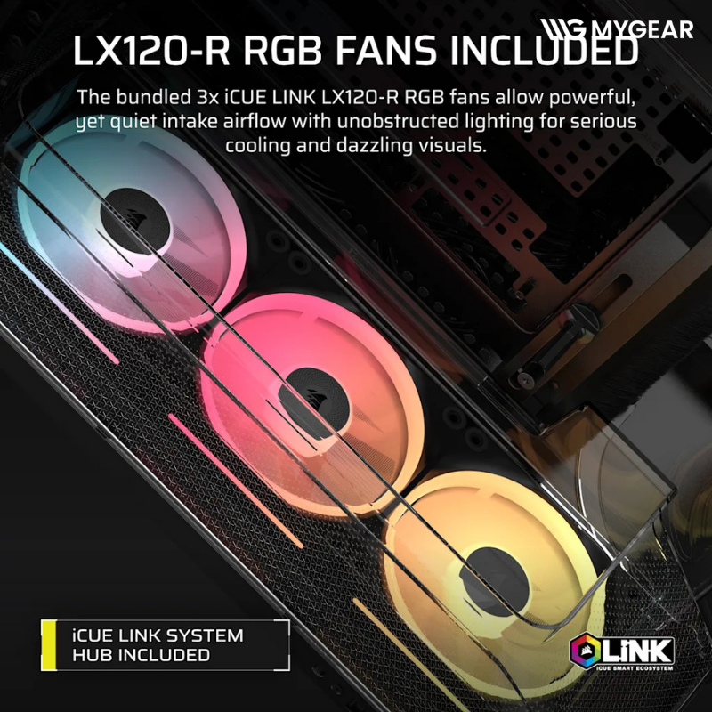 | Quạt đi kèm | 3 x iCUE LINK LX-R RGB 120mm Reverse-Rotor Fans, System Hub (Hỗ trợ 24 thiết bị) |