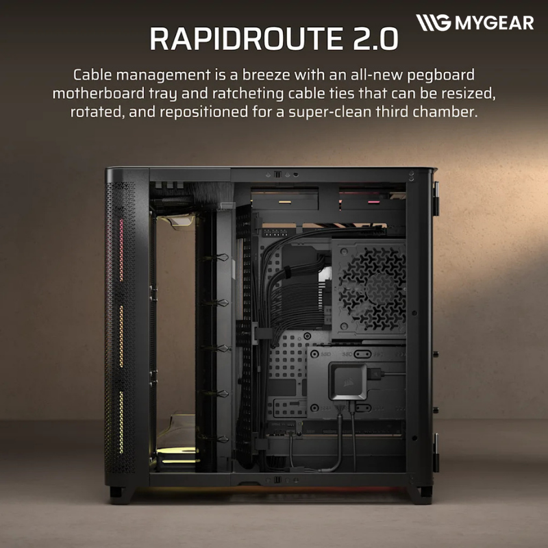 Với 134mm không gian đi dây, RapidRoute 2.0 trên vỏ case Corsair AIR 5400 LX-R giúp người dùng dễ dàng quản lý cáp ngay cả khi sử dụng nhiều thiết bị iCUE LINK, đảm bảo hệ thống luôn gọn gàng và tối ưu airflow.