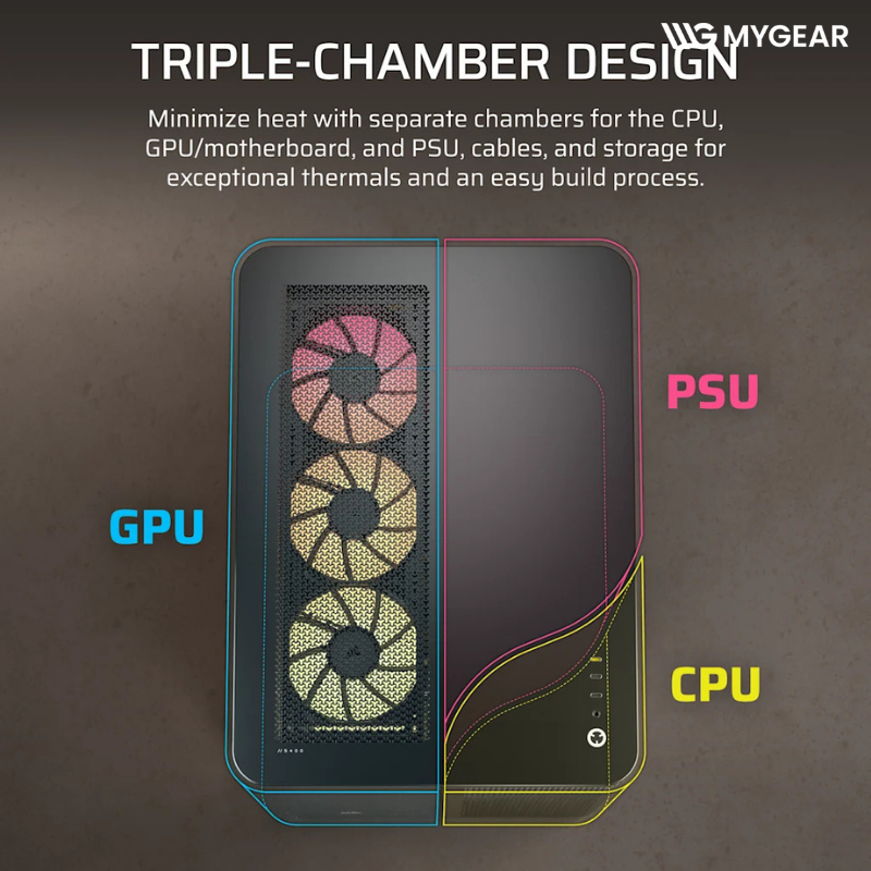 Điểm nổi bật nhất của vỏ case Corsair AIR 5400 RS-R chính là thiết kế triple chamber case với ba khoang độc lập dành cho mainboard GPU, PSU ổ cứng và hệ thống làm mát. Cách bố trí giúp luồng khí lưu thông hiệu quả hơn, giảm nhiệt chéo giữa các linh kiện và mang lại không gian lắp đặt cực kỳ thoáng đãng. Thiết kế triple chamber cũng giúp reverse connector case phát huy tối đa lợi thế khi toàn bộ dây cáp được giấu gọn phía sau, mang lại vẻ ngoài sạch sẽ và chuyên nghiệp.