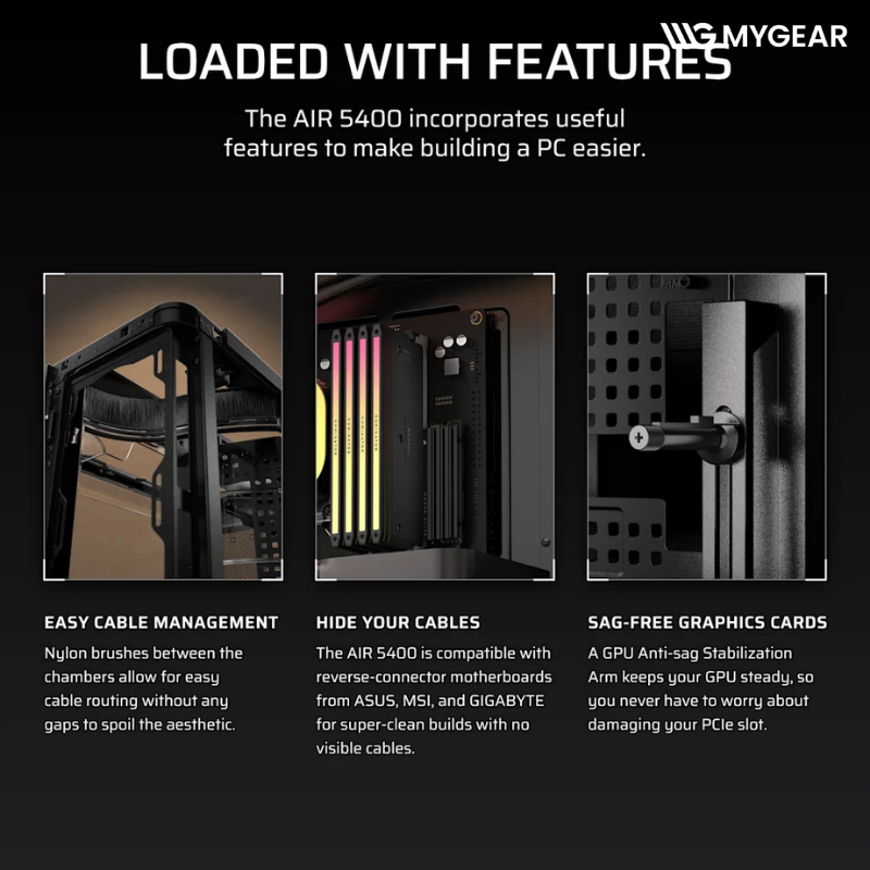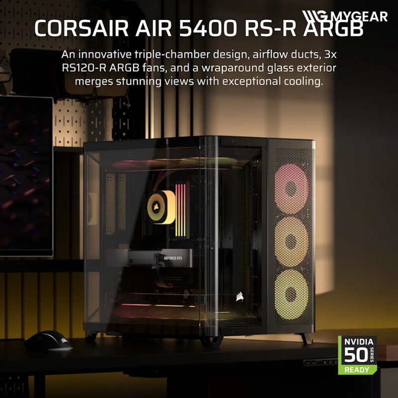 Khi build tại MYGEAR, vỏ case Corsair AIR 5400 RS-R ARGB CC-9011318-WW tương thích hoàn hảo với các linh kiện đang có sẵn như mainboard ATX E-ATX reverse connector ASUS MSI Gigabyte, CPU Intel Core i7 i9 và AMD Ryzen cao cấp, card màn hình RTX 5070 RTX 5080 RTX 5090, nguồn Corsair công suất lớn, SSD NVMe Gen4, tản nhiệt khí cao cấp và tản nước AIO 360mm, giúp người dùng dễ dàng build một bộ PC gaming hoặc workstation cao cấp tại MYGEAR.