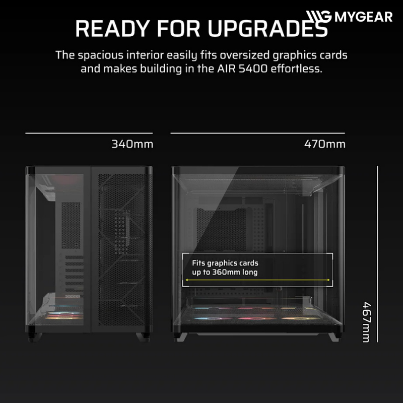 Corsair AIR 5400 RS-R model CC-9011318-WW hỗ trợ card đồ họa dài tối đa 360mm, phù hợp với các GPU cao cấp hiện nay. Đồng thời, chiều cao tản CPU lên đến 180mm giúp người dùng thoải mái lựa chọn các mẫu tản khí hiệu năng cao.