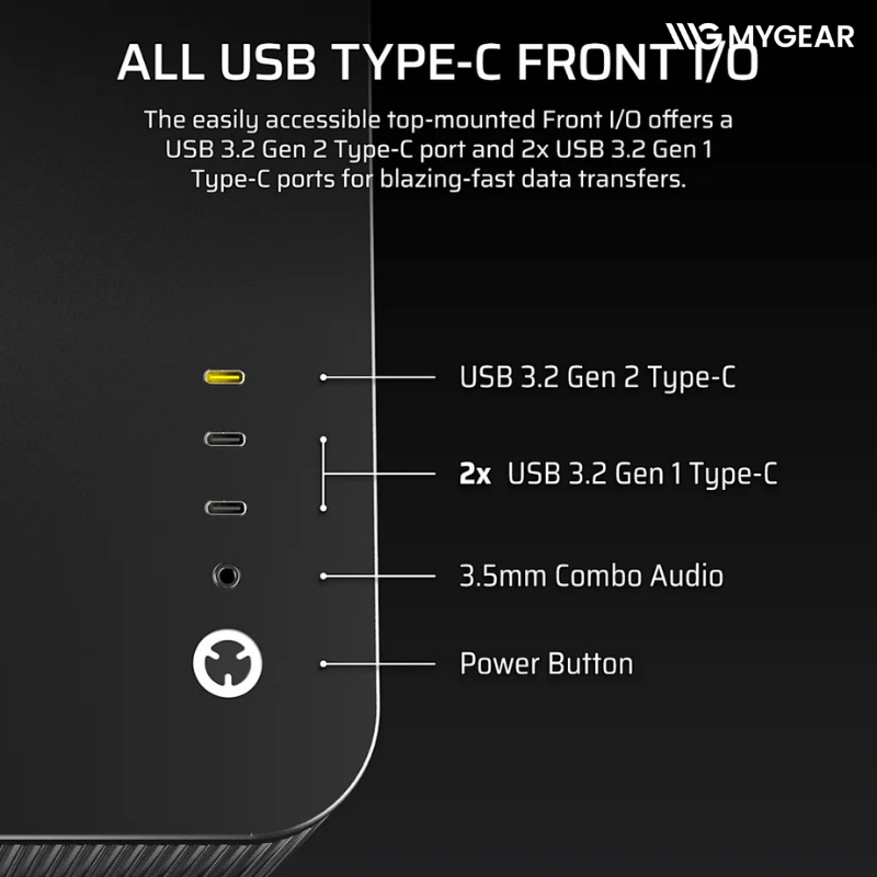 | Cổng I/O trước | 1x USB 3.2 Gen 2 Type-C, 2x USB 3.2 Gen 1 Type-C, 1x Audio in/out |