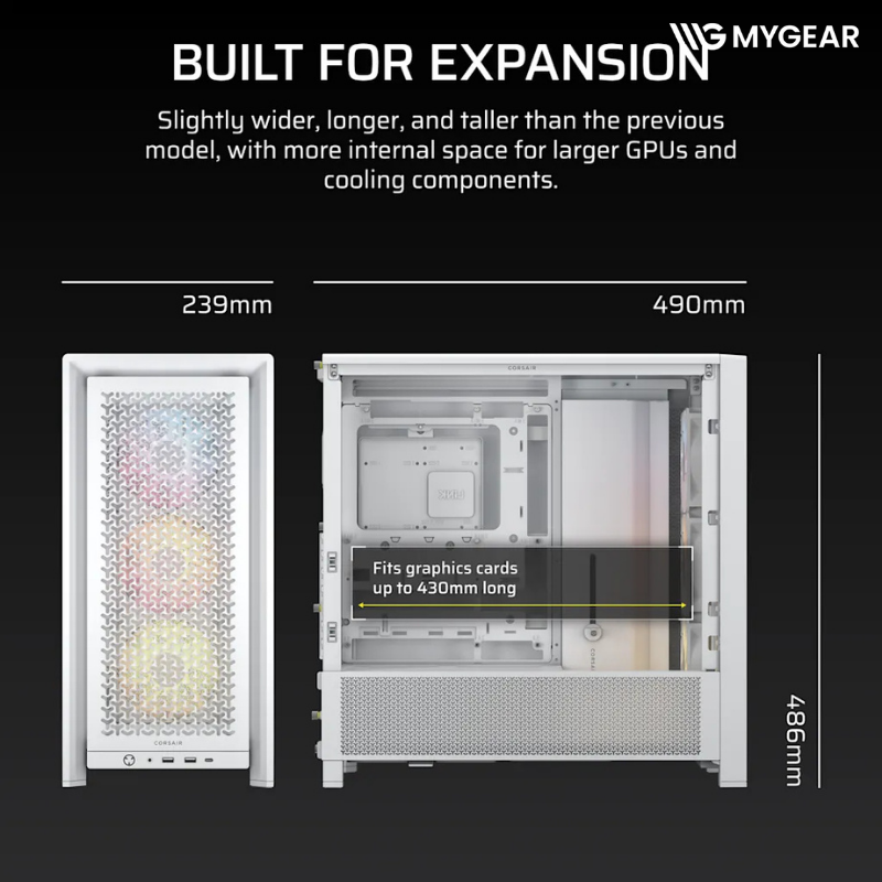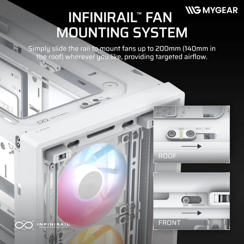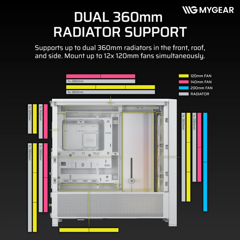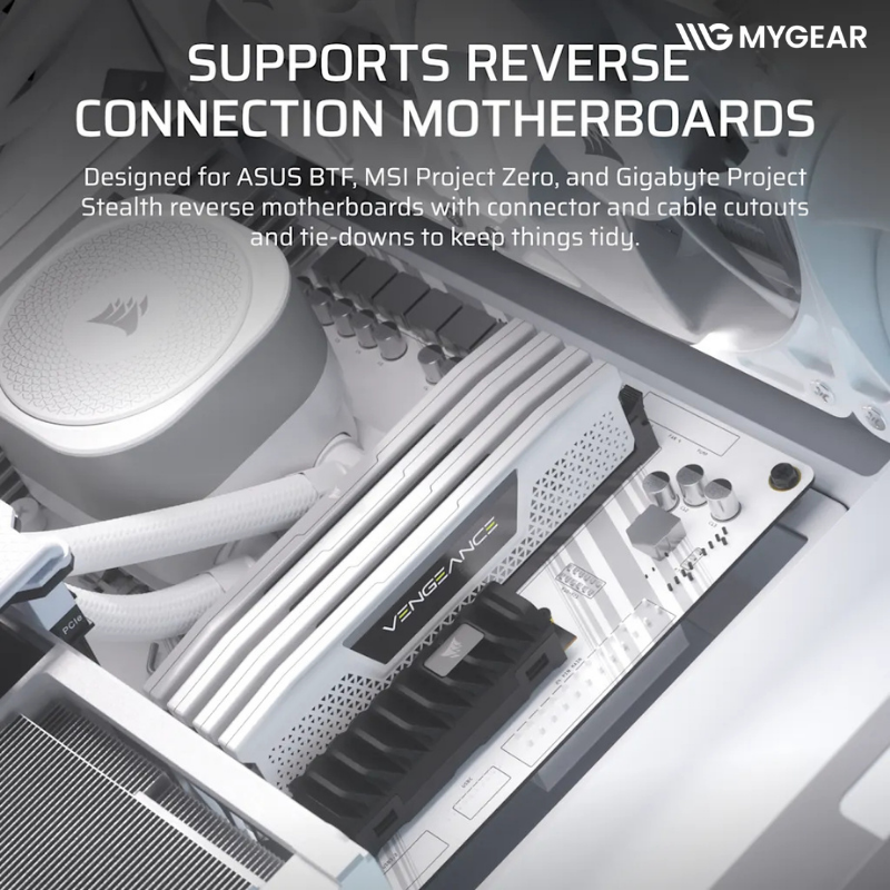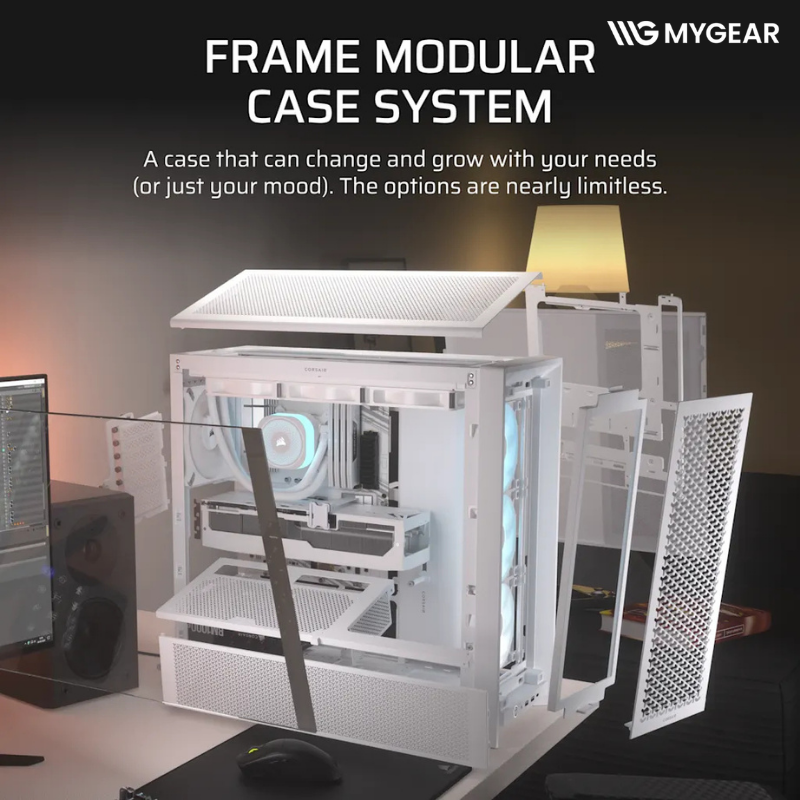 Khi build tại MYGEAR, Corsair FRAME 4000D RS ARGB White tương thích hoàn hảo với các linh kiện đang có sẵn như CPU Intel Core và CPU AMD Ryzen, mainboard ATX E-ATX, card màn hình RTX 5060 RTX 5070, RAM DDR4 DDR5 RGB, SSD NVMe Gen4, nguồn Corsair công suất lớn, tản nhiệt nước AIO 240mm 360mm, fan ARGB, giúp người dùng dễ dàng hoàn thiện một bộ PC gaming hoặc PC làm việc thẩm mỹ cao tại MYGEAR.