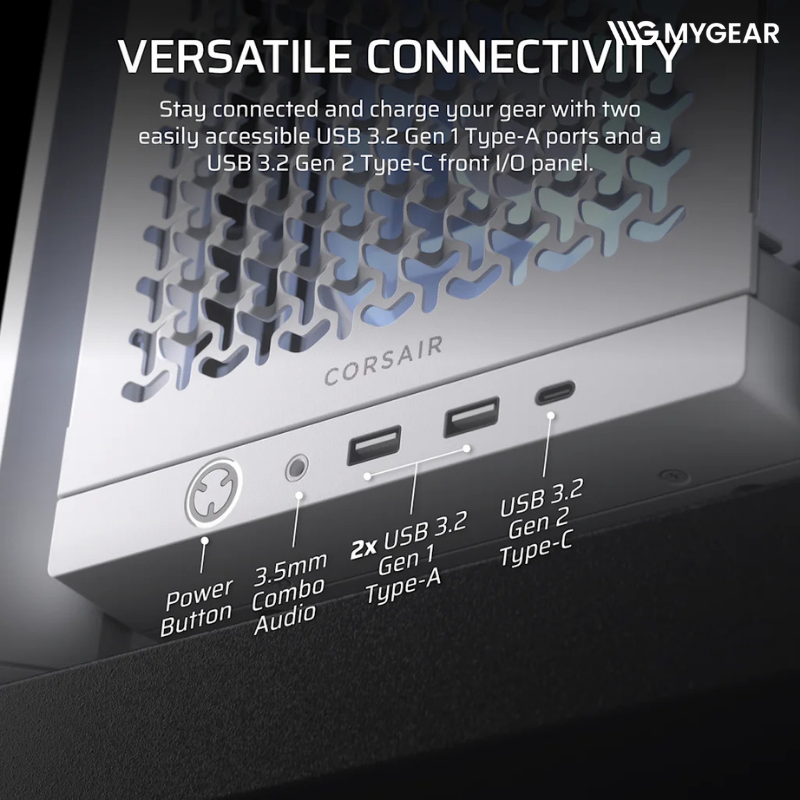 Mặt trước của Corsair FRAME 4000D được trang bị USB 3.2 Gen 2 Type-C, USB 3.2 Gen 1 Type-A và Audio in/out, đáp ứng tốt nhu cầu kết nối thiết bị ngoại vi tốc độ cao, đúng chuẩn một mẫu case hiện đại.