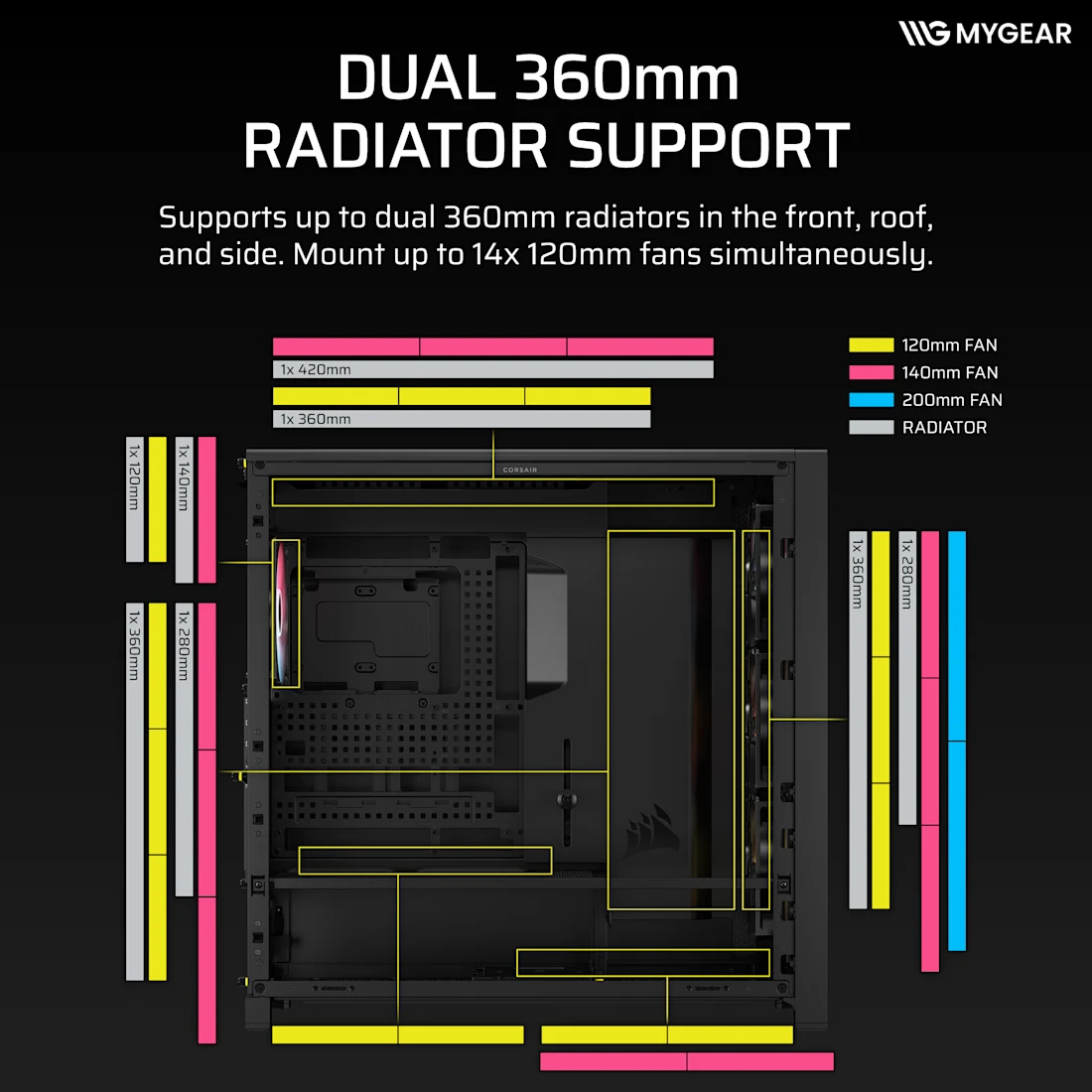 Không chỉ đẹp, Corsair Frame 5000D còn được thiết kế tối ưu luồng gió hỗ trợ tối đa 14 quạt 120mm hoặc 140mm, khả năng lắp đặt radiator 360mm ở mặt trước, trên hoặc bên hông và phía sau. Tất cả giúp dàn máy luôn mát mẻ khi hoạt động ở hiệu suất cao, đặc biệt với các CPU và card màn hình cao cấp.