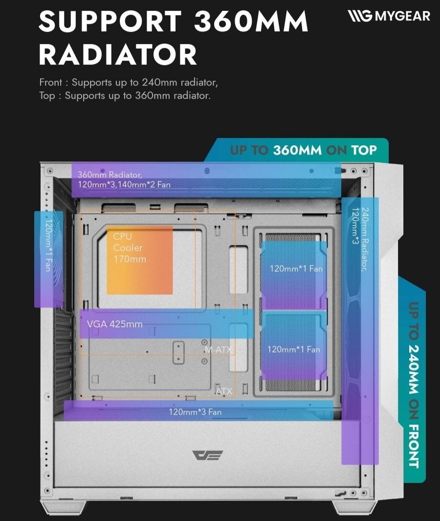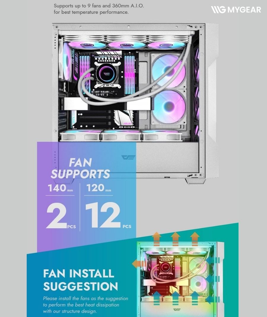 Đúng với dòng Mesh, vỏ case máy tính DarkFlash trắng mang đến khả năng lưu thông không khí tối ưu. Mặt trước dạng lưới mesh kết hợp cùng vị trí lắp đặt radiator hoặc tản nhiệt nước lên đến 360mm, giúp hệ thống luôn mát mẻ khi chơi game hoặc làm việc cường độ cao.